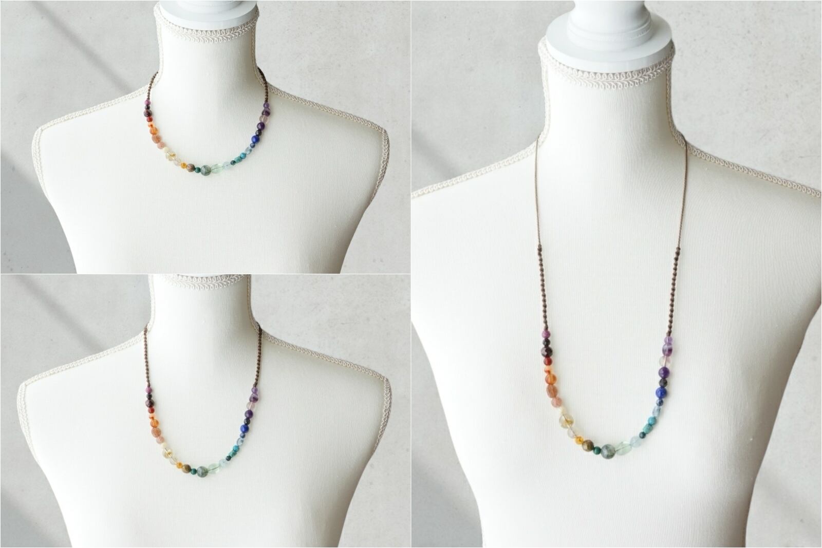 様々な個性を持つ天然石を7色カラーで繋いだお守りロングネックレス。