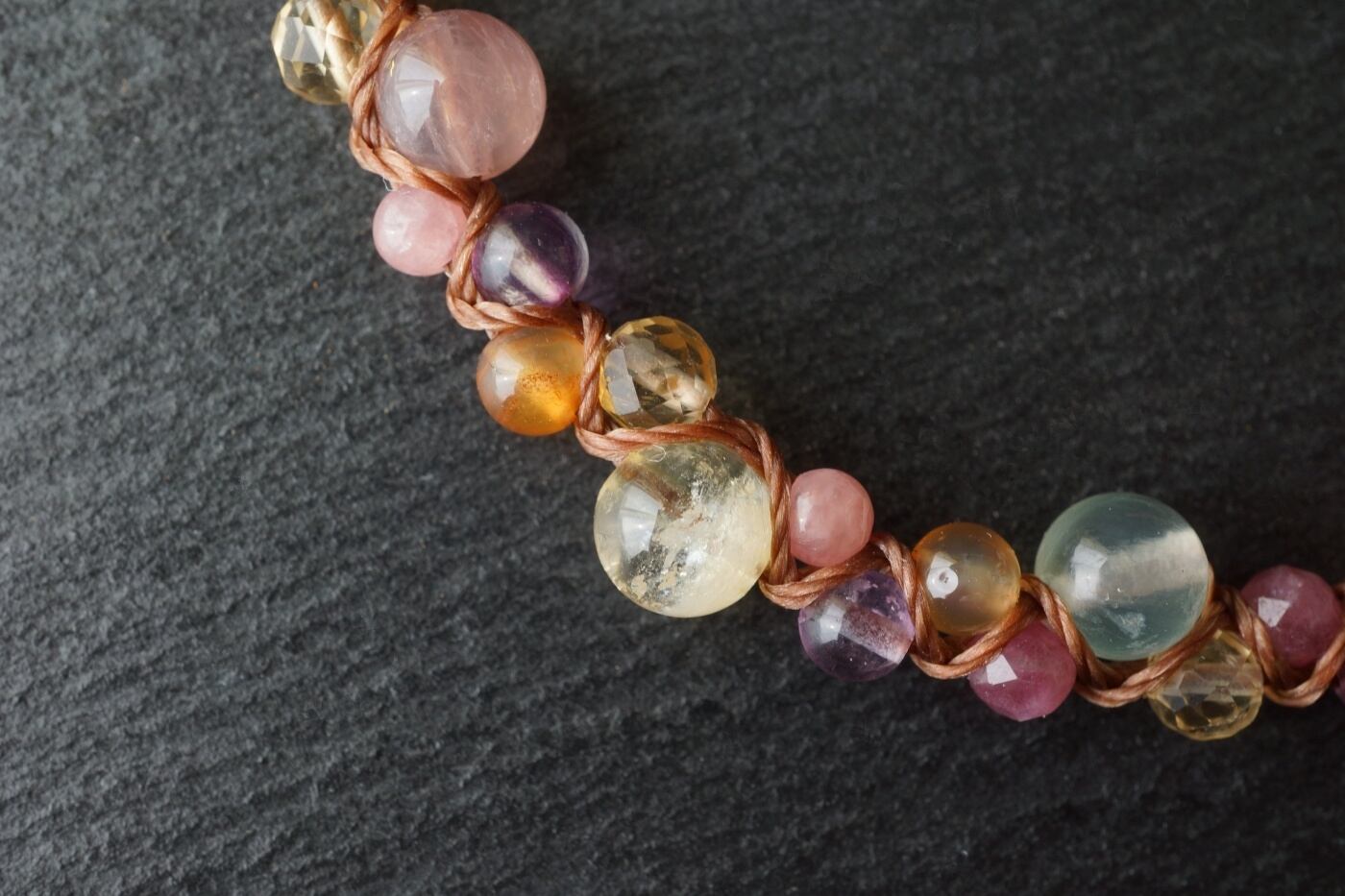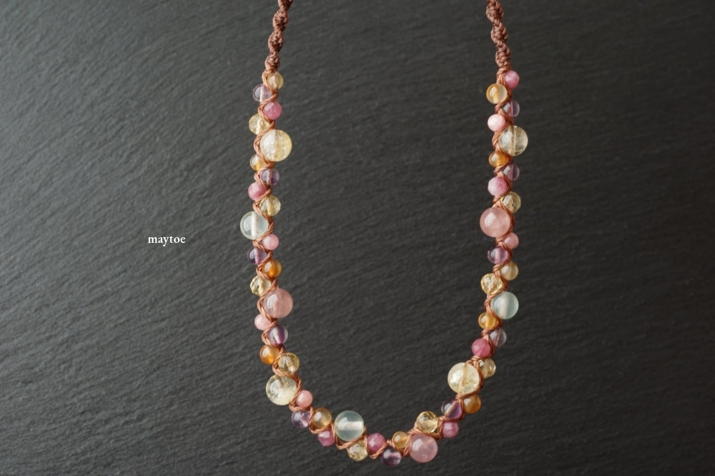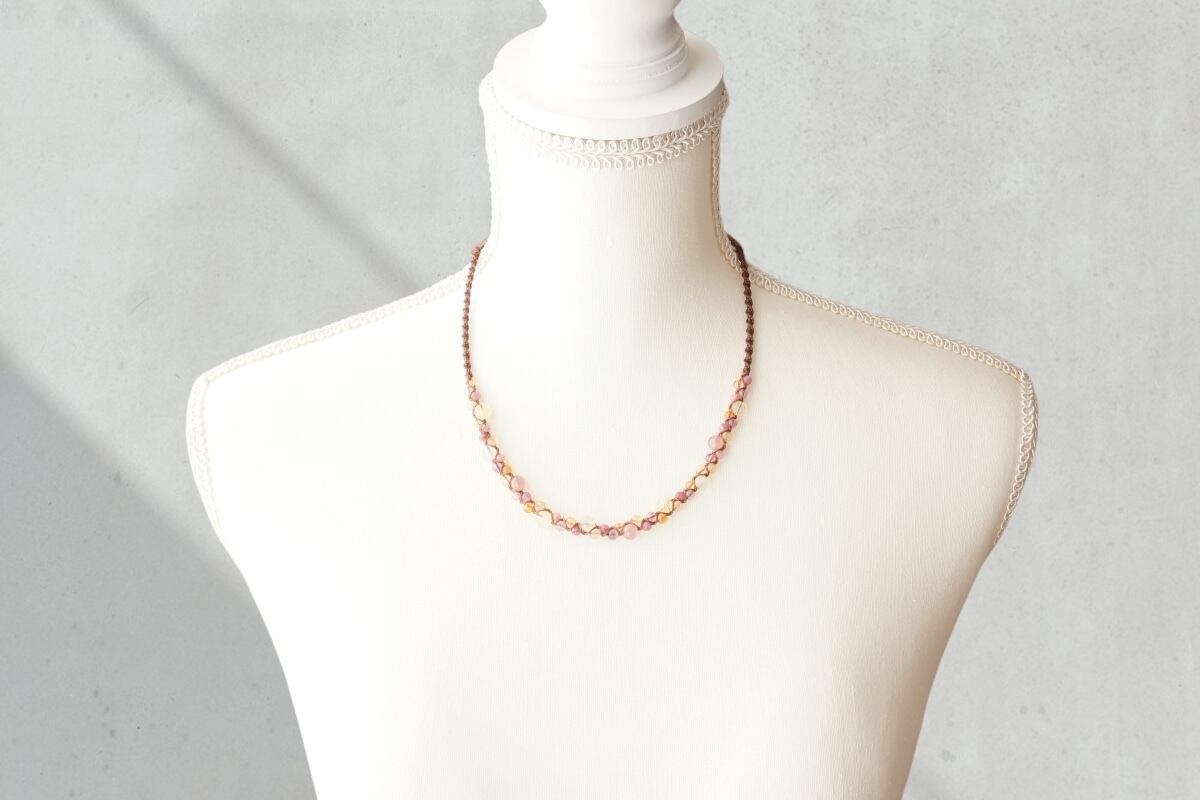 これ1つで映える、ディープローズクォーツ、シトリン、プレナイトなど淡く透明度のある石を繋いだ花束のような色合いの天然石マクラメネックレス。