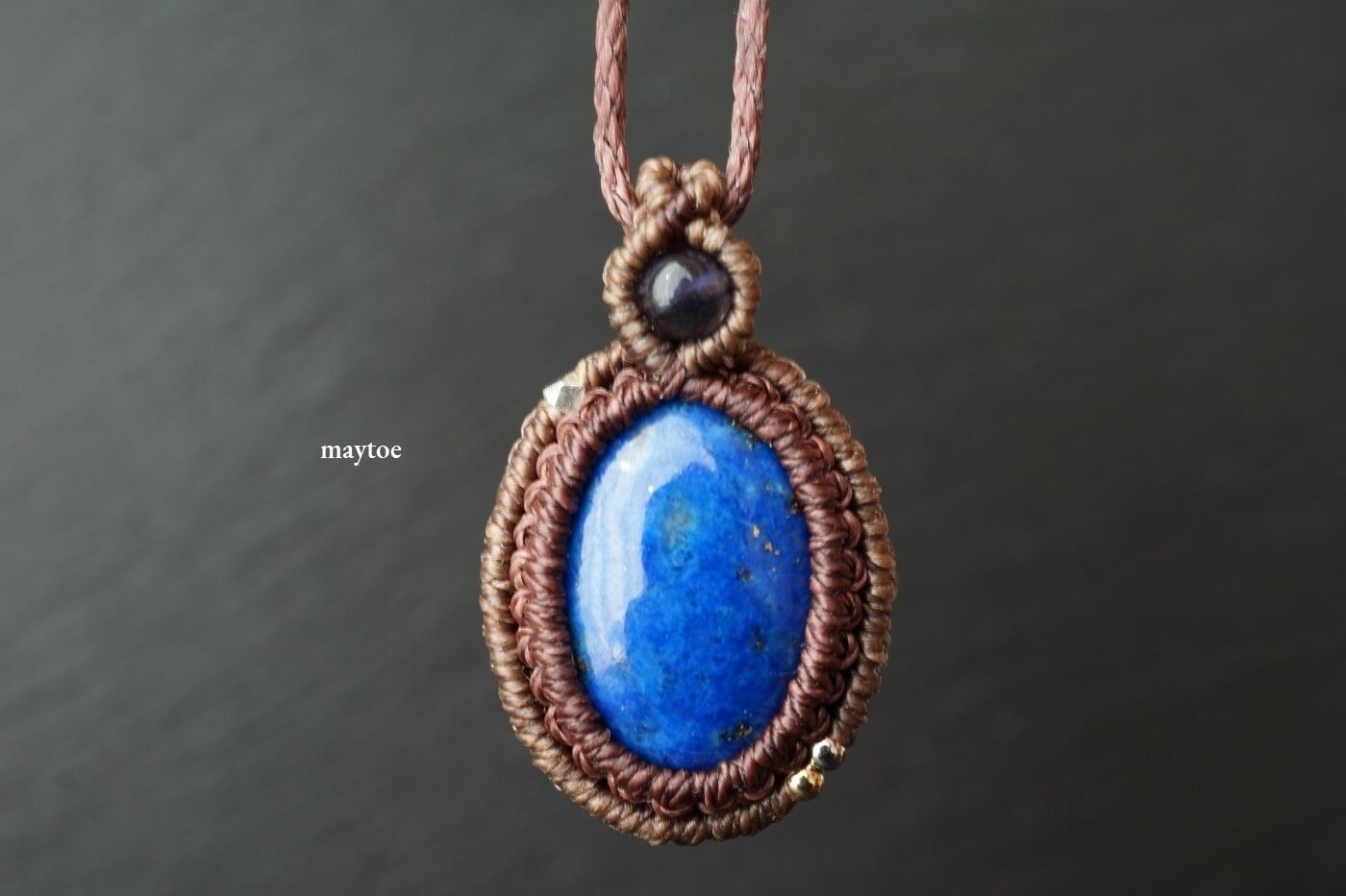 鮮やかで温もりある瑠璃色に星のような模様のパイライトをもつラピスラズリのマクラメネックレス。