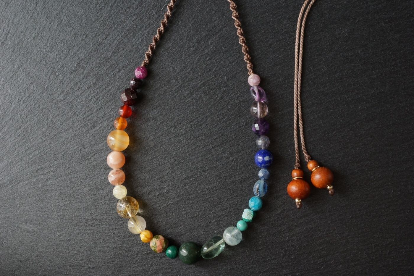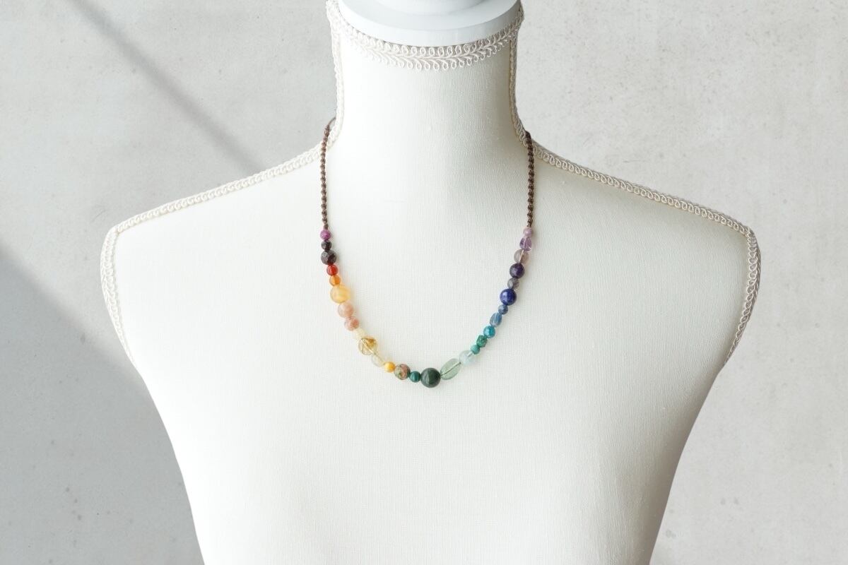 様々な個性を持つ天然石を7色カラーで繋いだお守りロングネックレス。