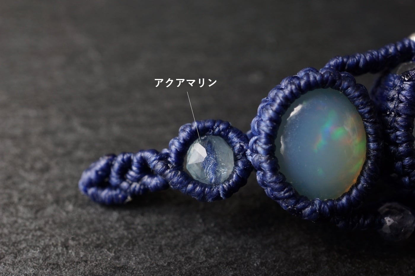 幻想的な遊色効果を持つエチオピア産のプレシャスオパールとブルーシラーと透明感が綺麗なレインボームーンストーンを組み合わせたオリジナルマクラメブレスレット。