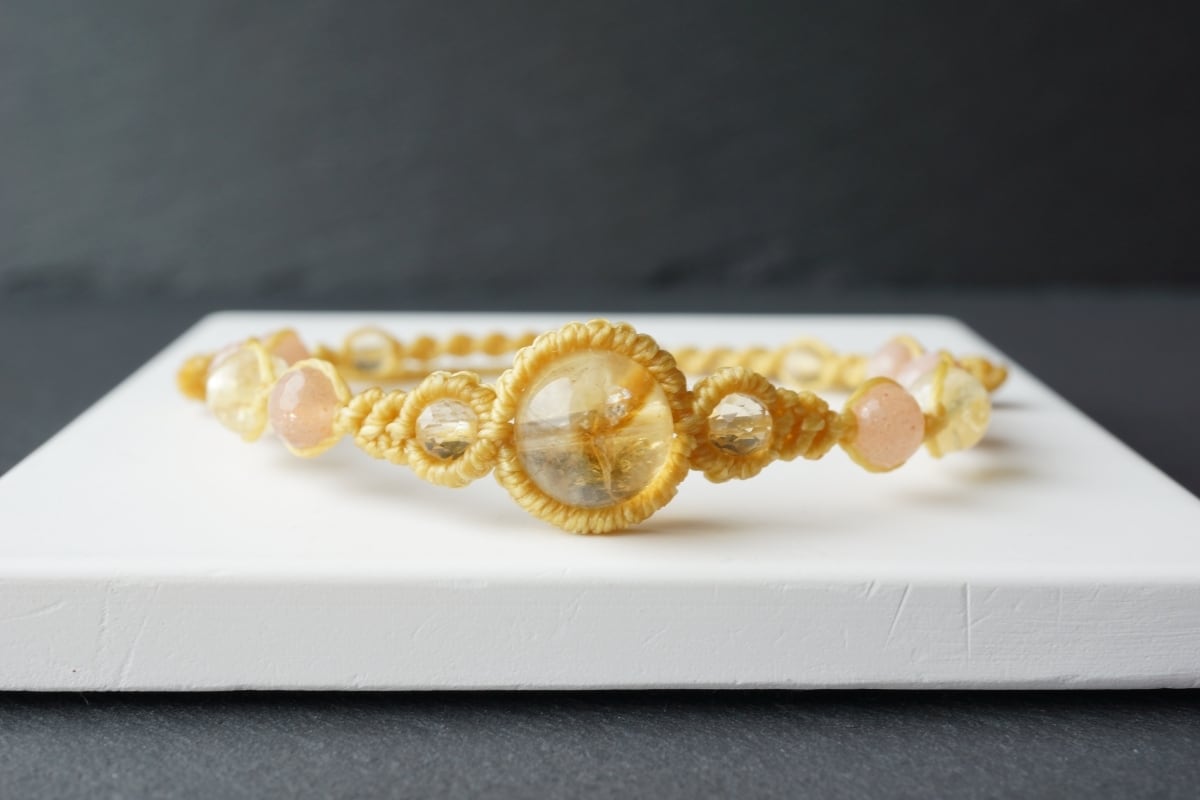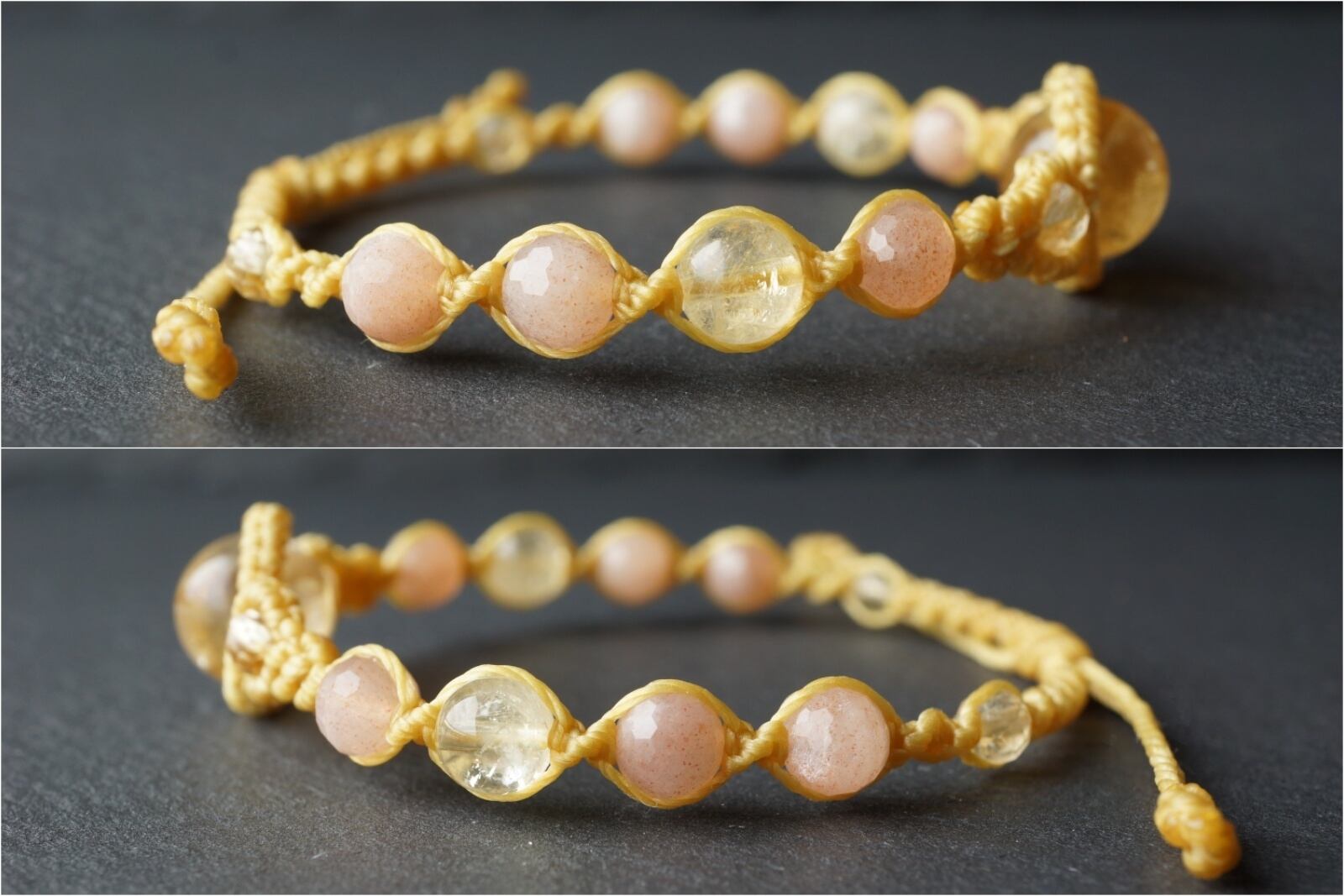 ブランデーファントムシトリンとオレンジムーンストーンを組み合わせた積極性を促すお守りマクラメブレスレット。