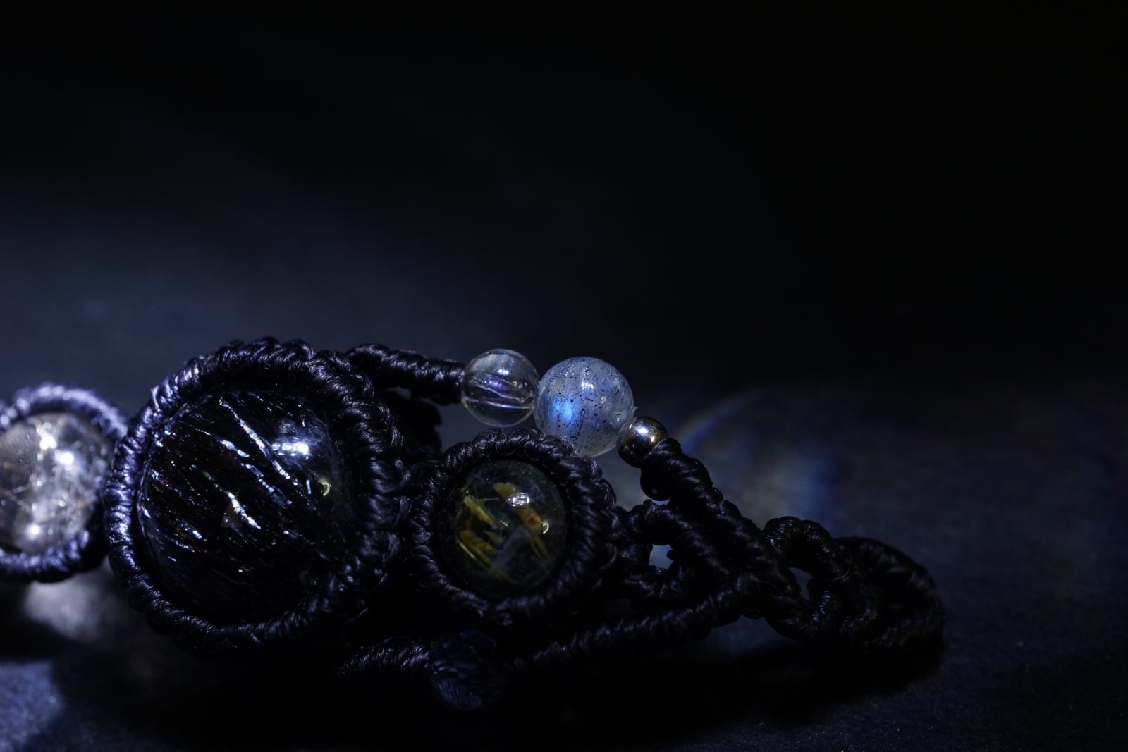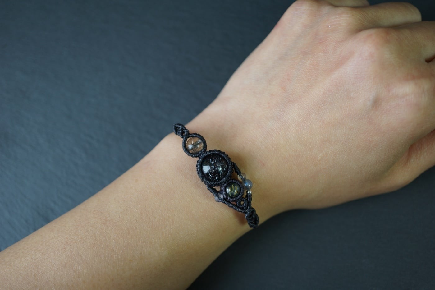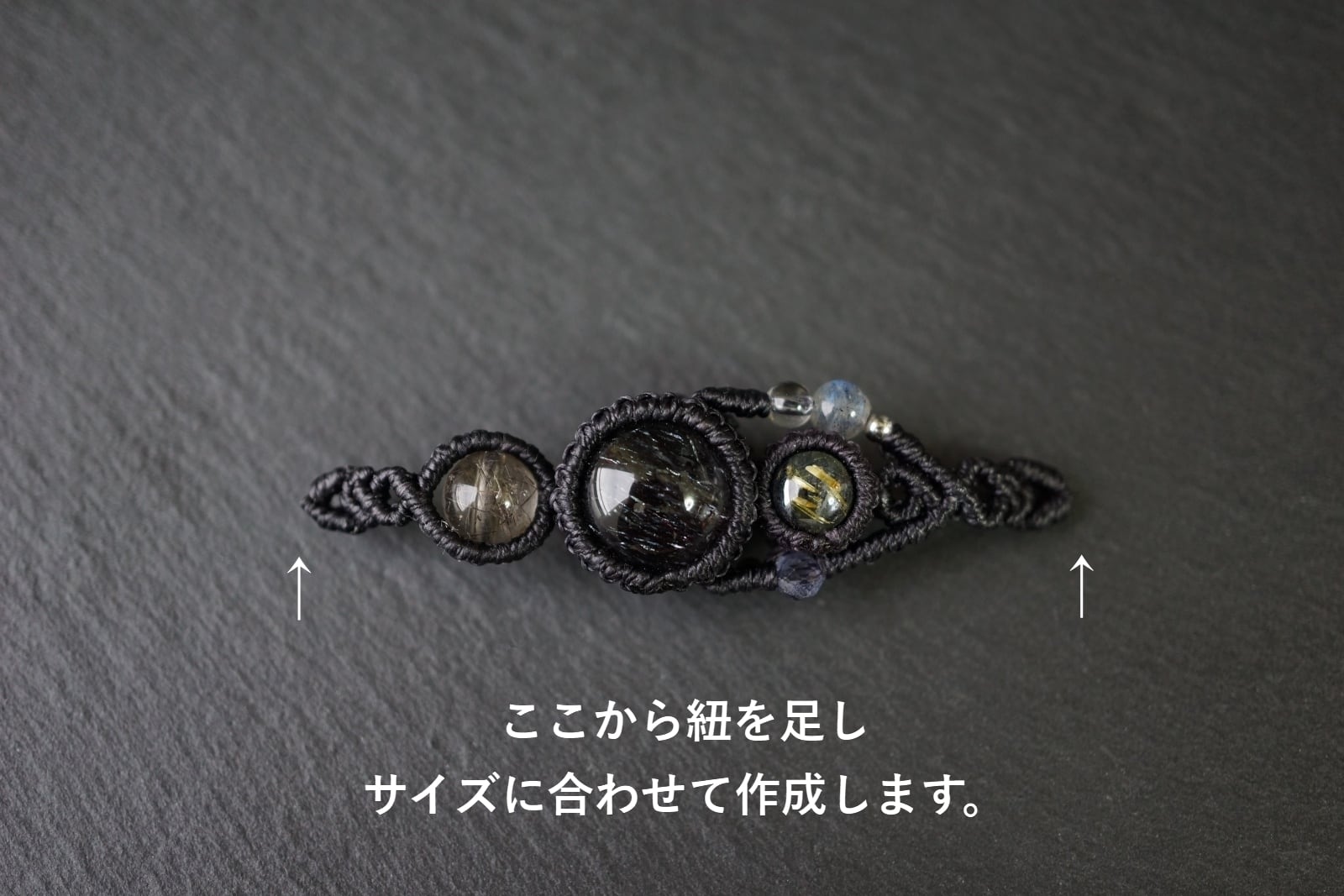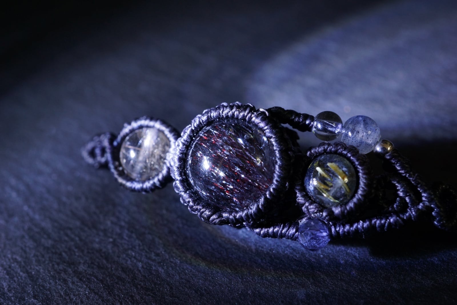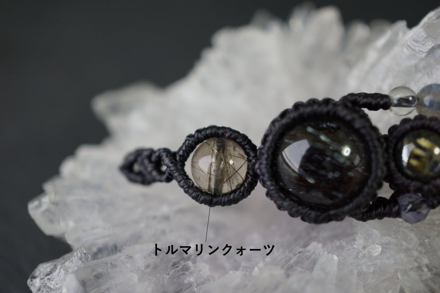 花火スーパーセブン(エレスチャルクォーツ)&太陽放射ルチルクォーツ&トルマリンクォーツのマクラメブレスレット - galaxy -【一点物】