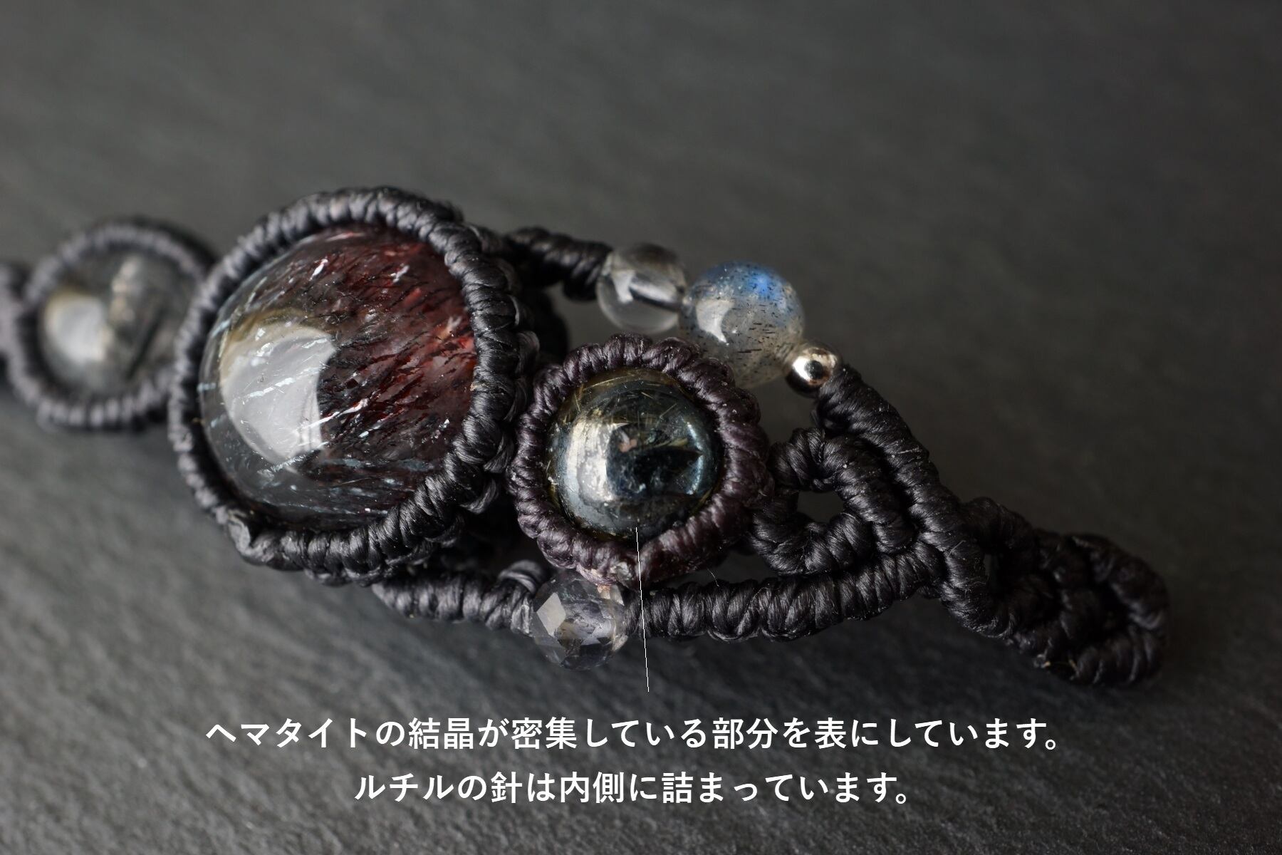 通常のスーパーセブンに内包されている赤~黒のレピドクロサイトの他に針状のヘマタイトが内包されており、この針がまるで花火のように銀色に美しく煌めくため「花火スーパーセブン」と名付けられた天然石。