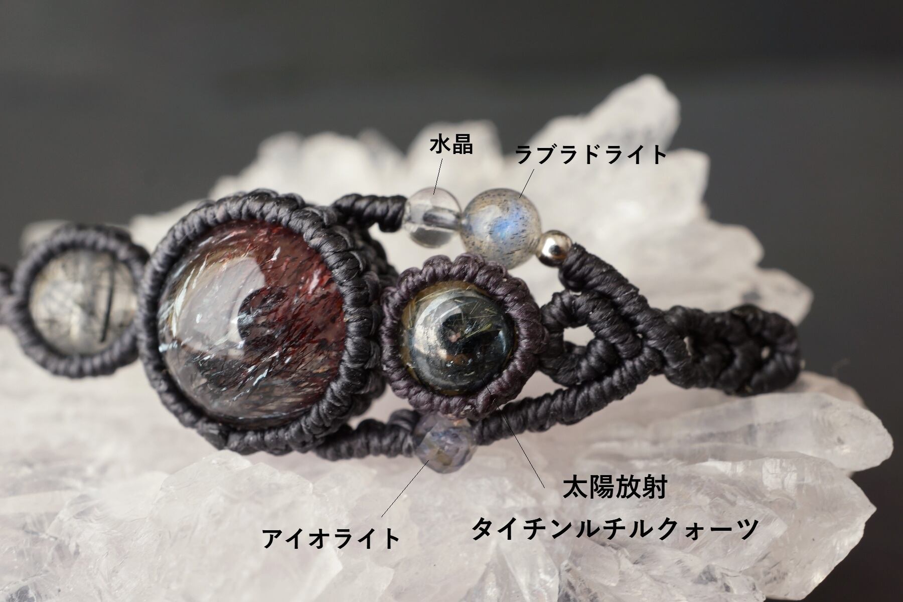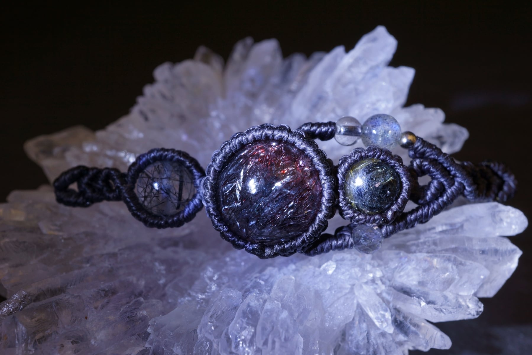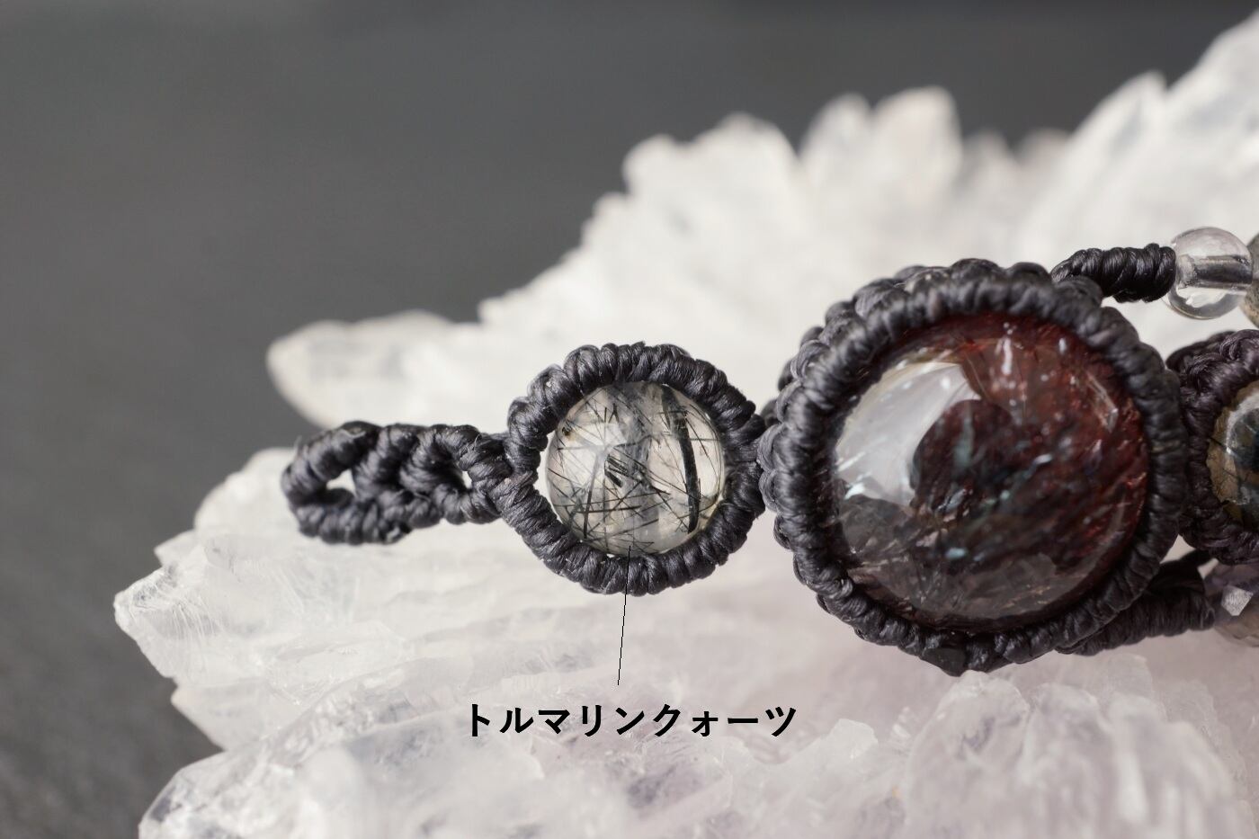 花火スーパーセブン(エレスチャルクォーツ)&太陽放射ルチルクォーツ&トルマリンクォーツのマクラメブレスレット - galaxy -【一点物】