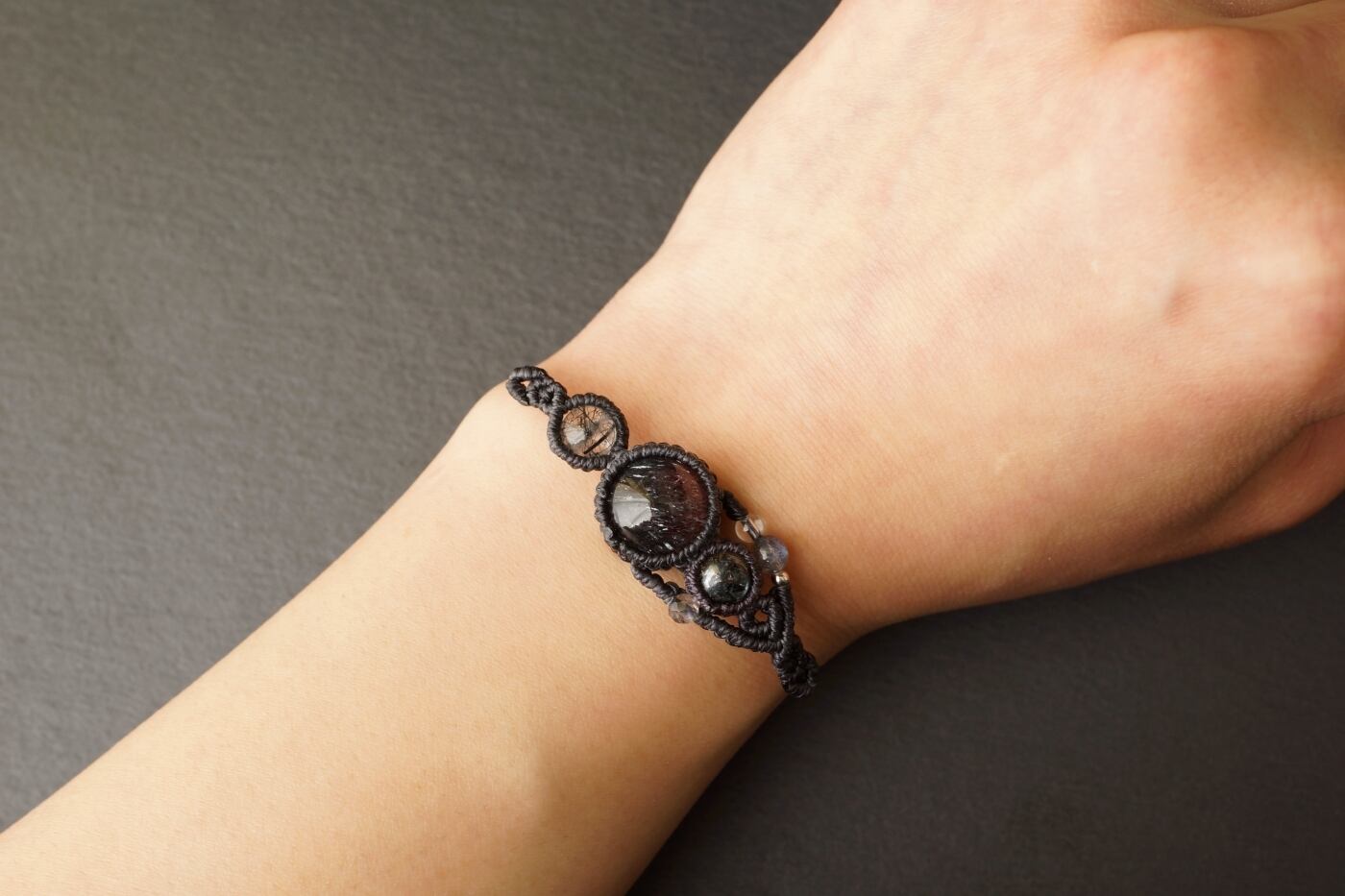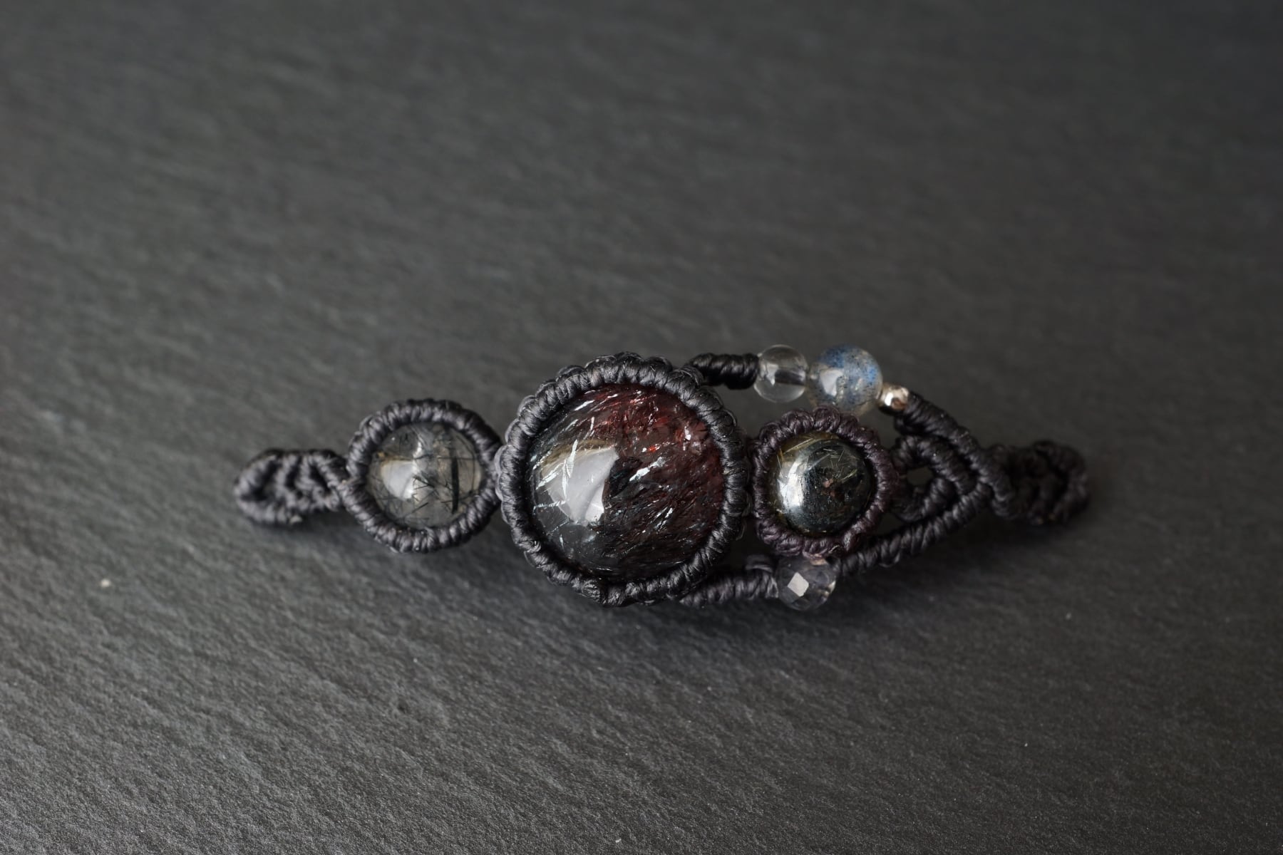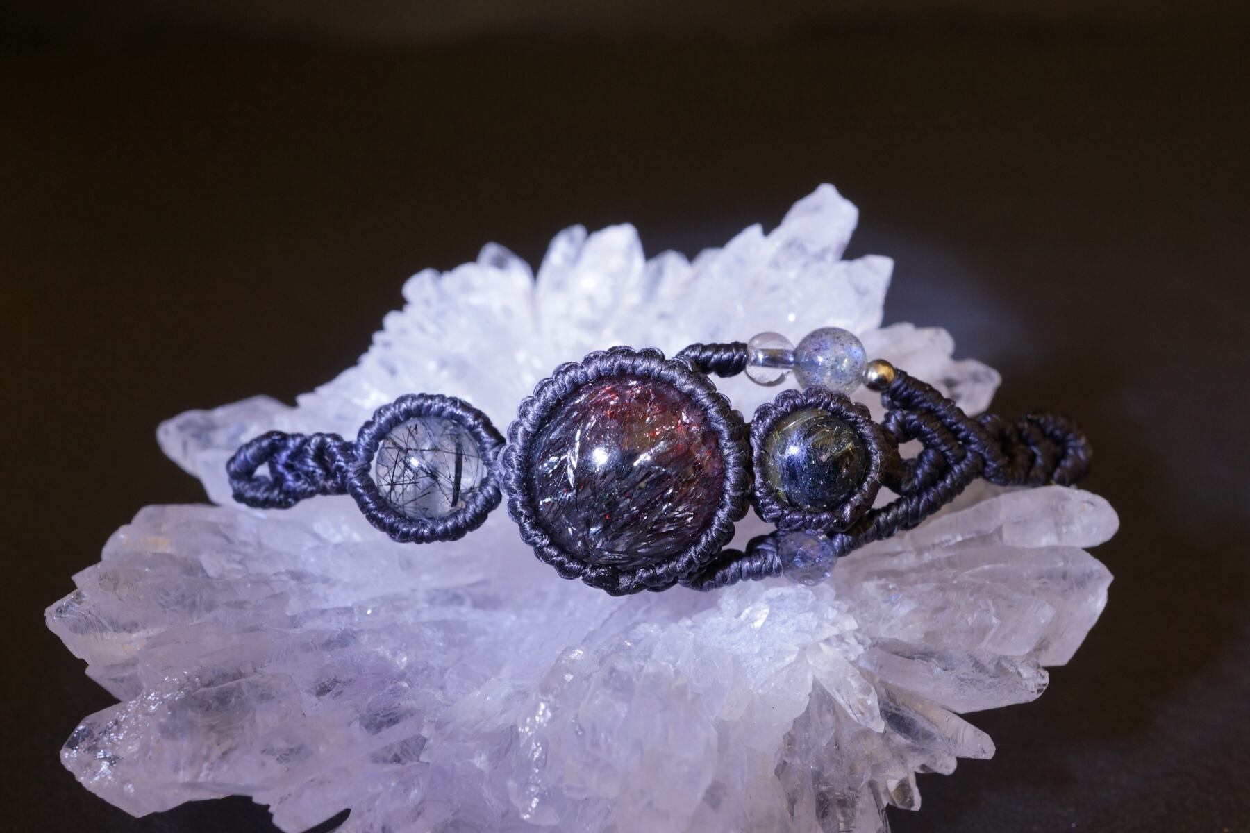 花火スーパーセブン(エレスチャルクォーツ)&太陽放射ルチルクォーツ&トルマリンクォーツのマクラメブレスレット - galaxy -【一点物】