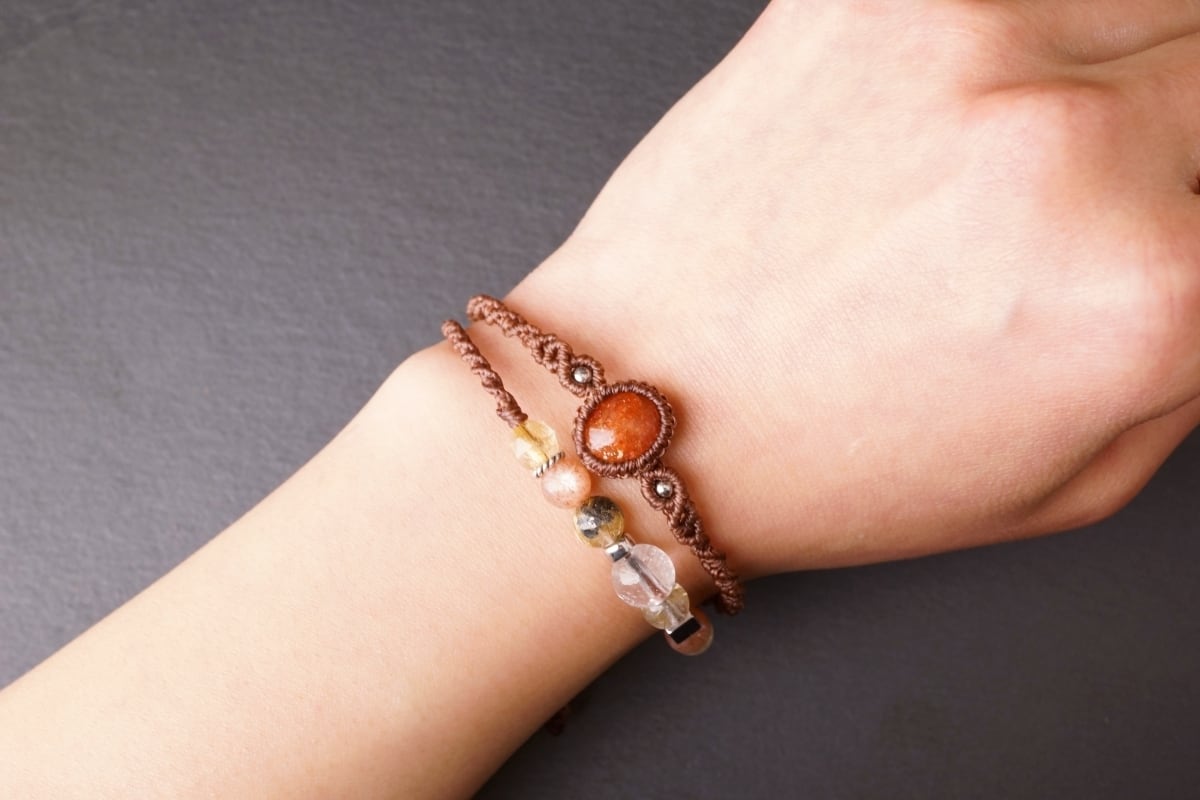 宝石質サンストーンをメインに二段目には太陽放射タイチンルチルクォーツ、ルチルクォーツ、マニカラン水晶を組み合わせた二重マクラメブレスレット。