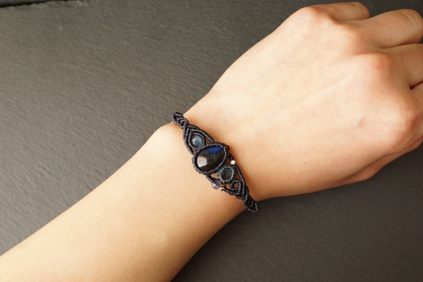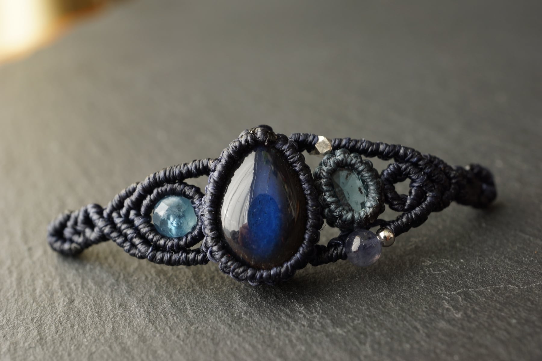 宝石質ブラックラブラドライト&インディゴブルーカイヤナイトのマクラメブレスレット - 深海 -【一点物】