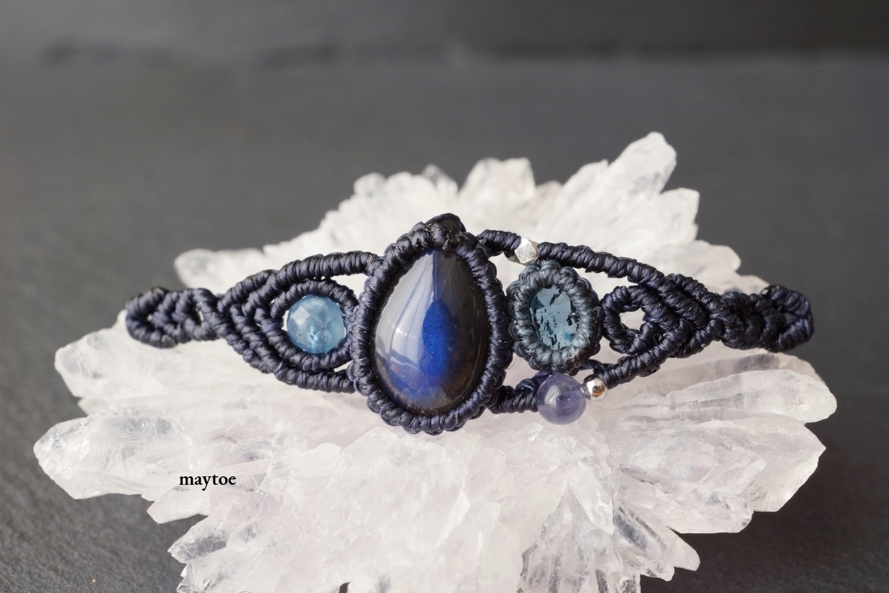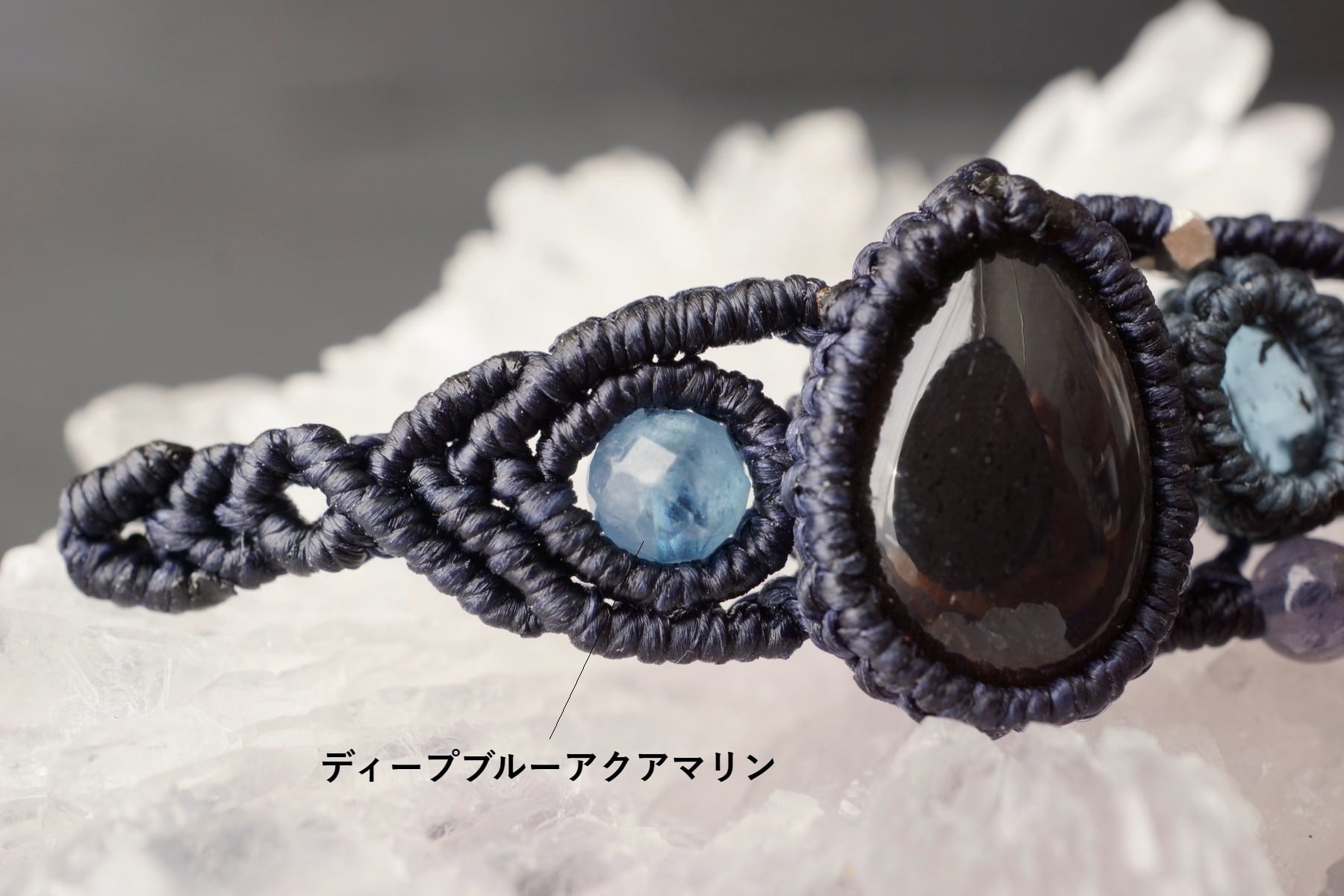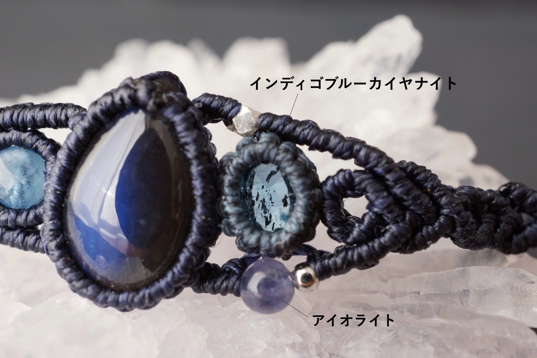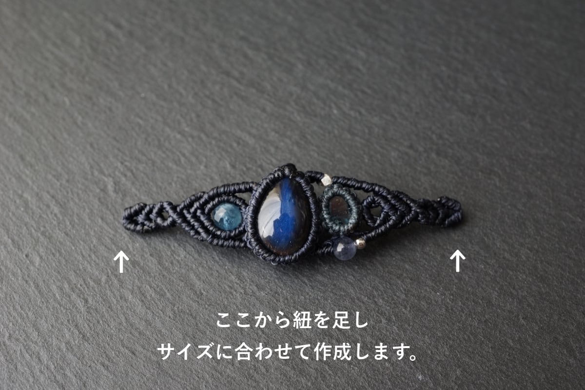 ブラックカラーの本体から広範囲に放つ神秘的なブルーのラブラドレッセンスをもつブラックラブラドライトと、透き通る奥深いブルーグリーンが魅力のインディゴブルーカイヤナイトを組み合わせ、深海の世界をイメージしたオリジナルマクラメブレスレット。