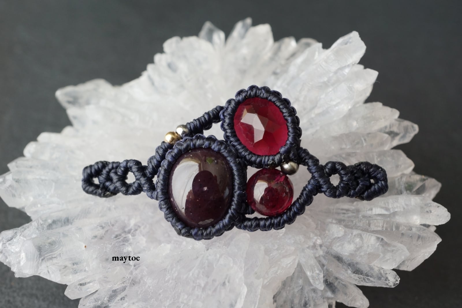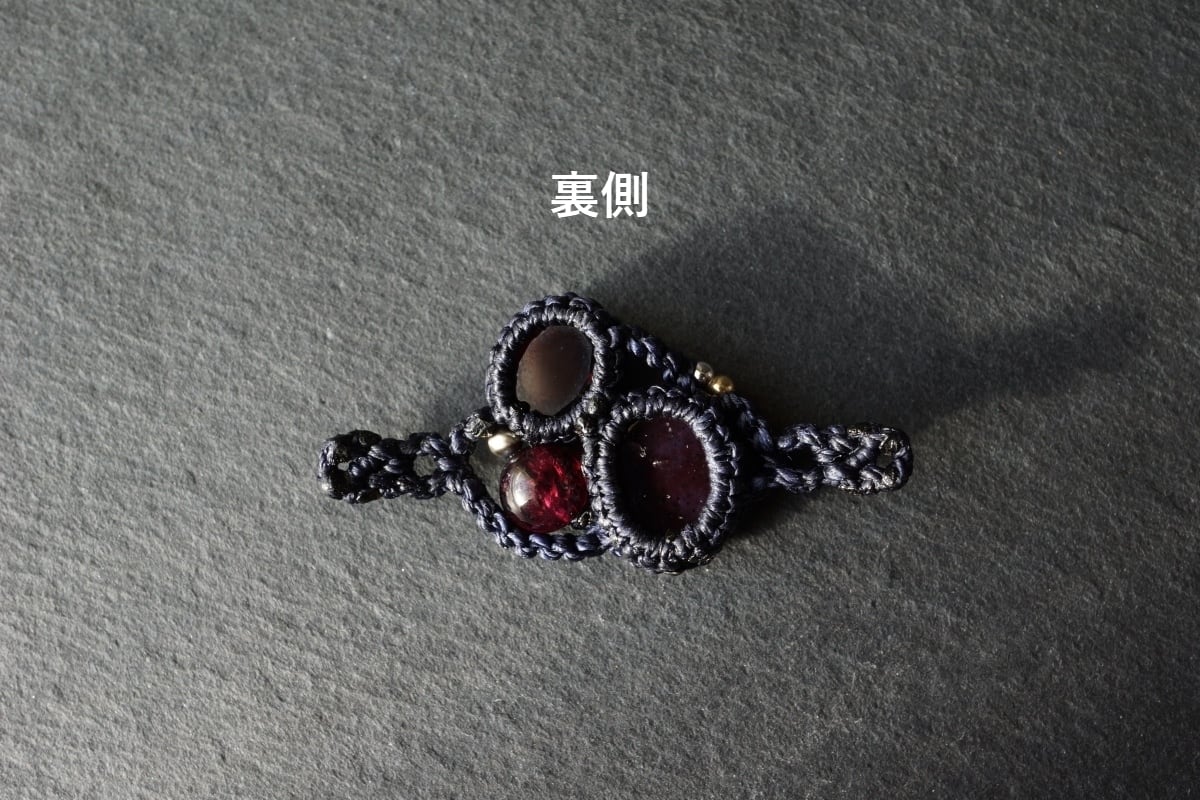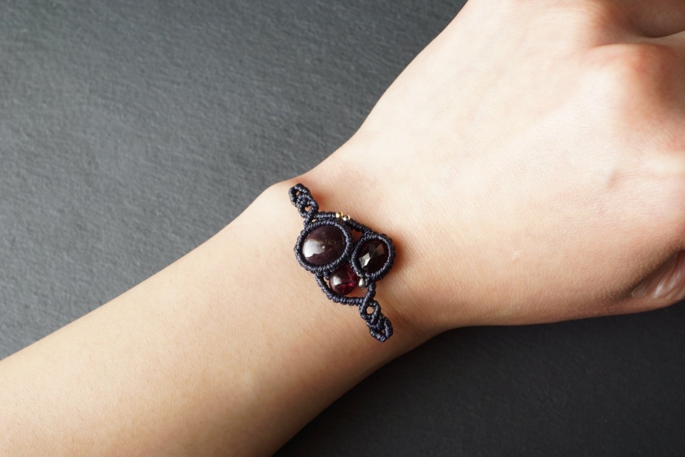 6条スターガーネットをメインに上品に輝く鮮やかなワインレッド色のロードライトガーネットを組み合わせた、オリジナルマクラメブレスレット。