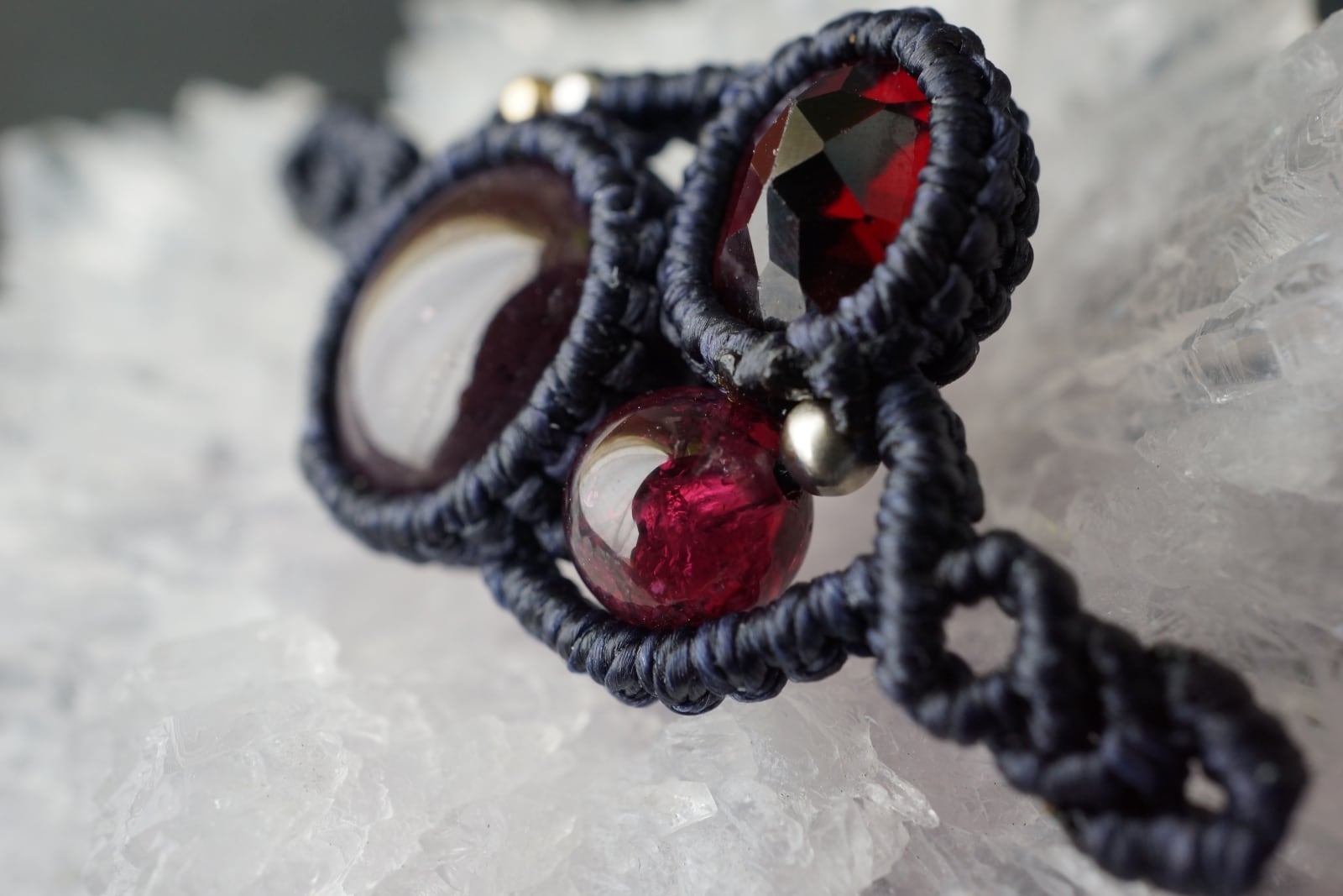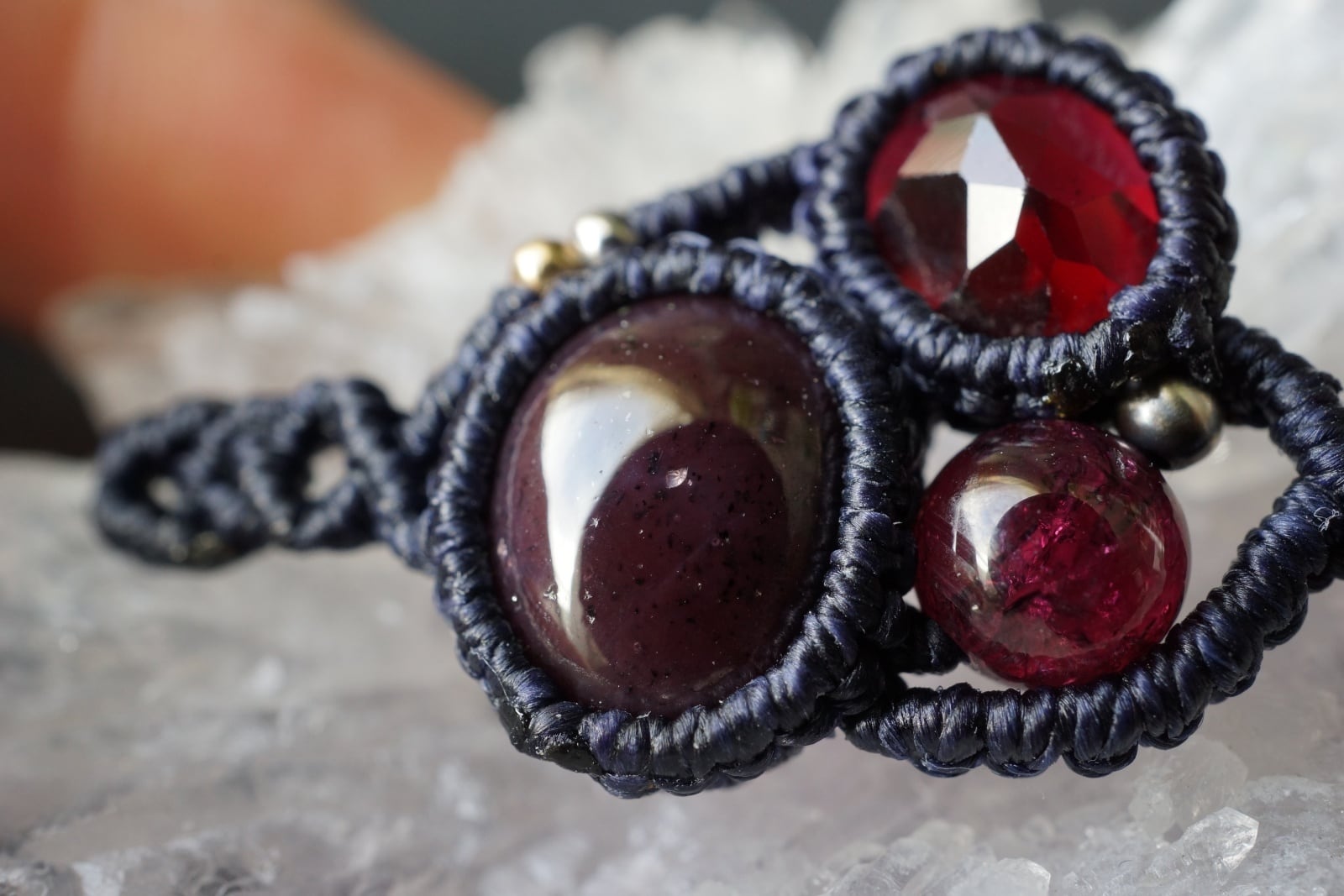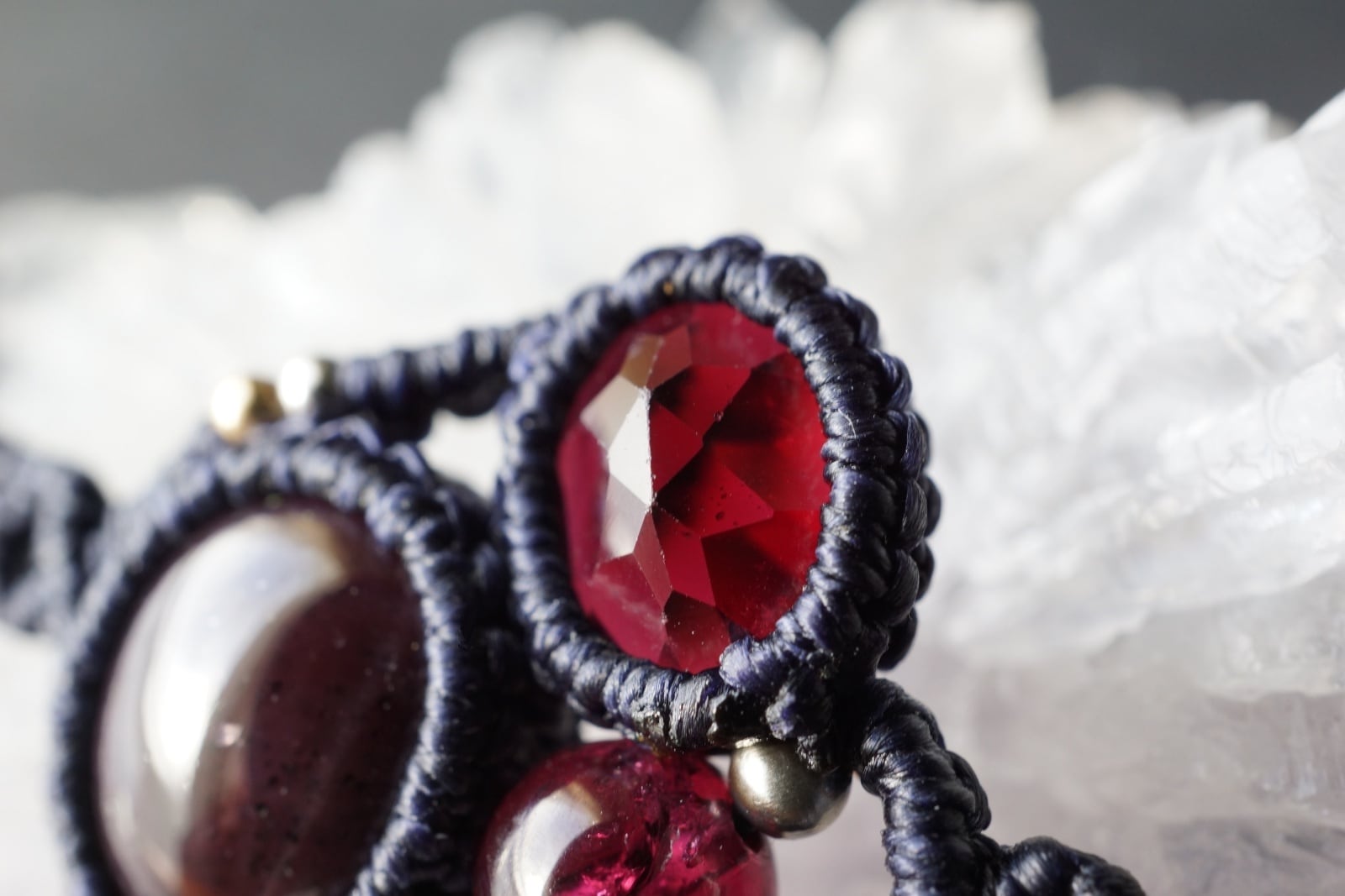 6条スターガーネットをメインに上品に輝く鮮やかなワインレッド色のロードライトガーネットを組み合わせた、オリジナルマクラメブレスレット。