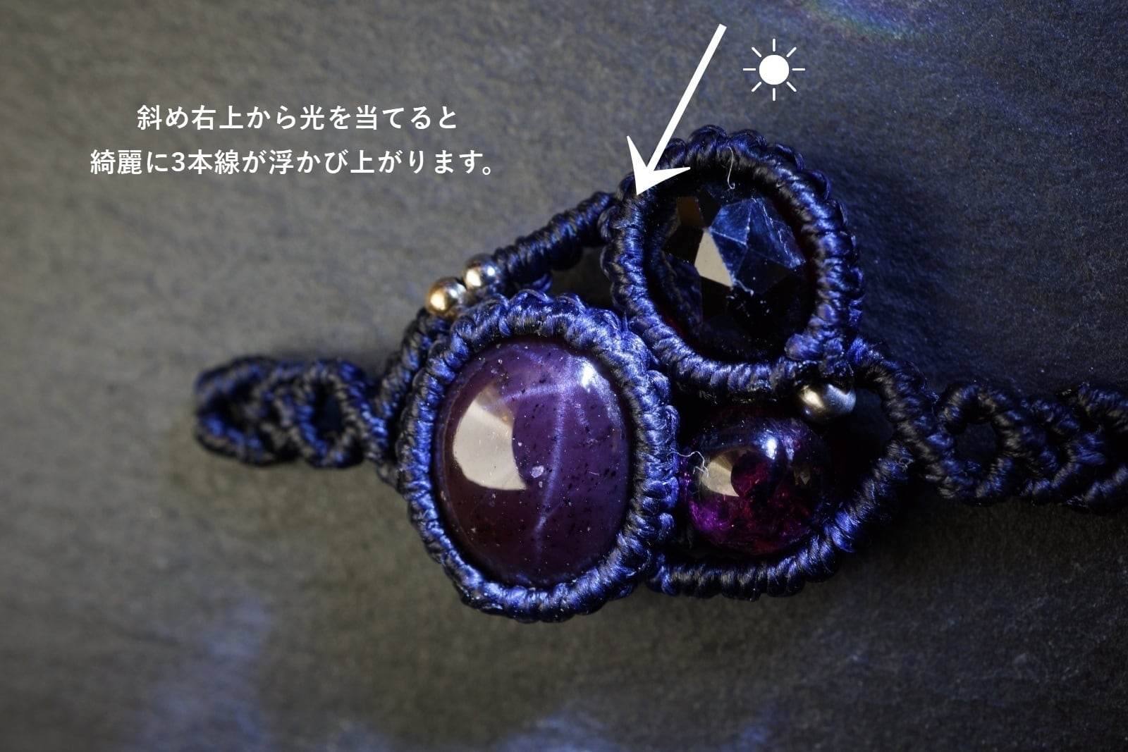 メインのスターガーネットは右上から強い光を当てると3本の光のライン(6条スター効果)が確認できます。