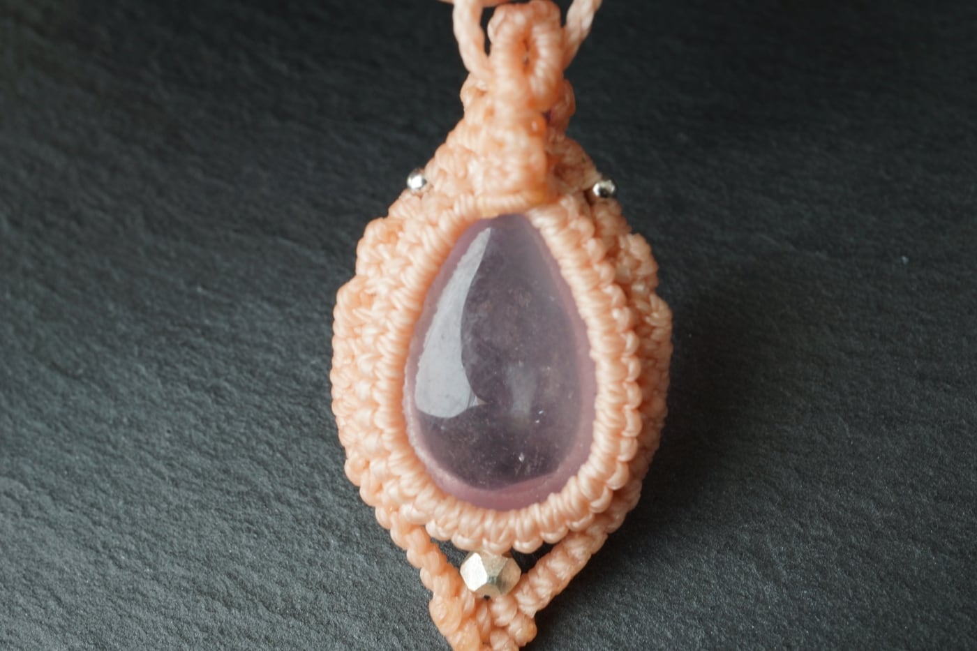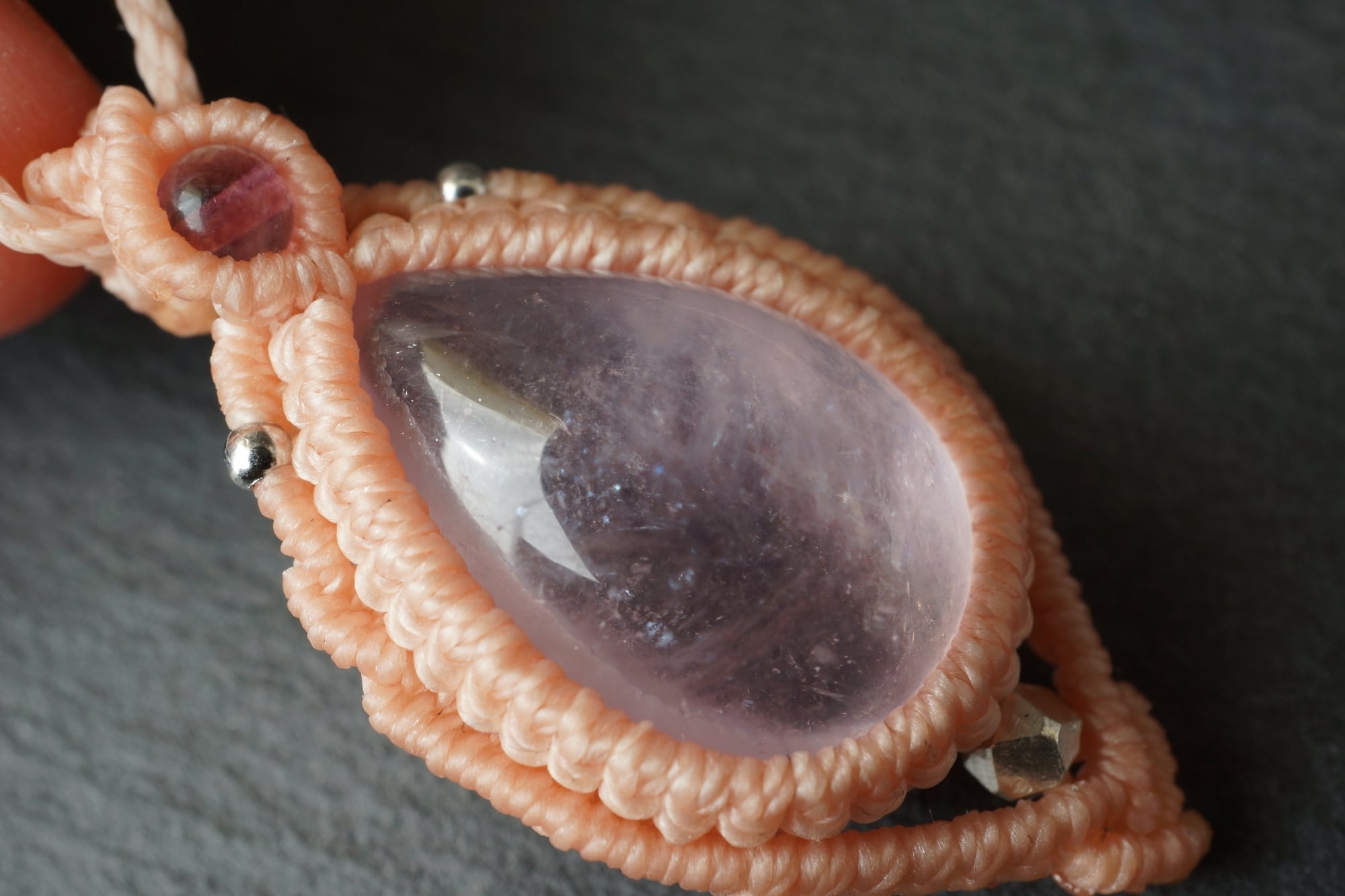トップ上には紫に少し赤みを混ぜた淡い色味のパープルフローライトを添え、桜に見立てたライトピーチの紐が石の透明感を静かに引き立てるデザインに仕上げています。紐先端にはアクアマリンとローズクォーツを配し、さりげない彩りを加えました。こちらは一点物です。