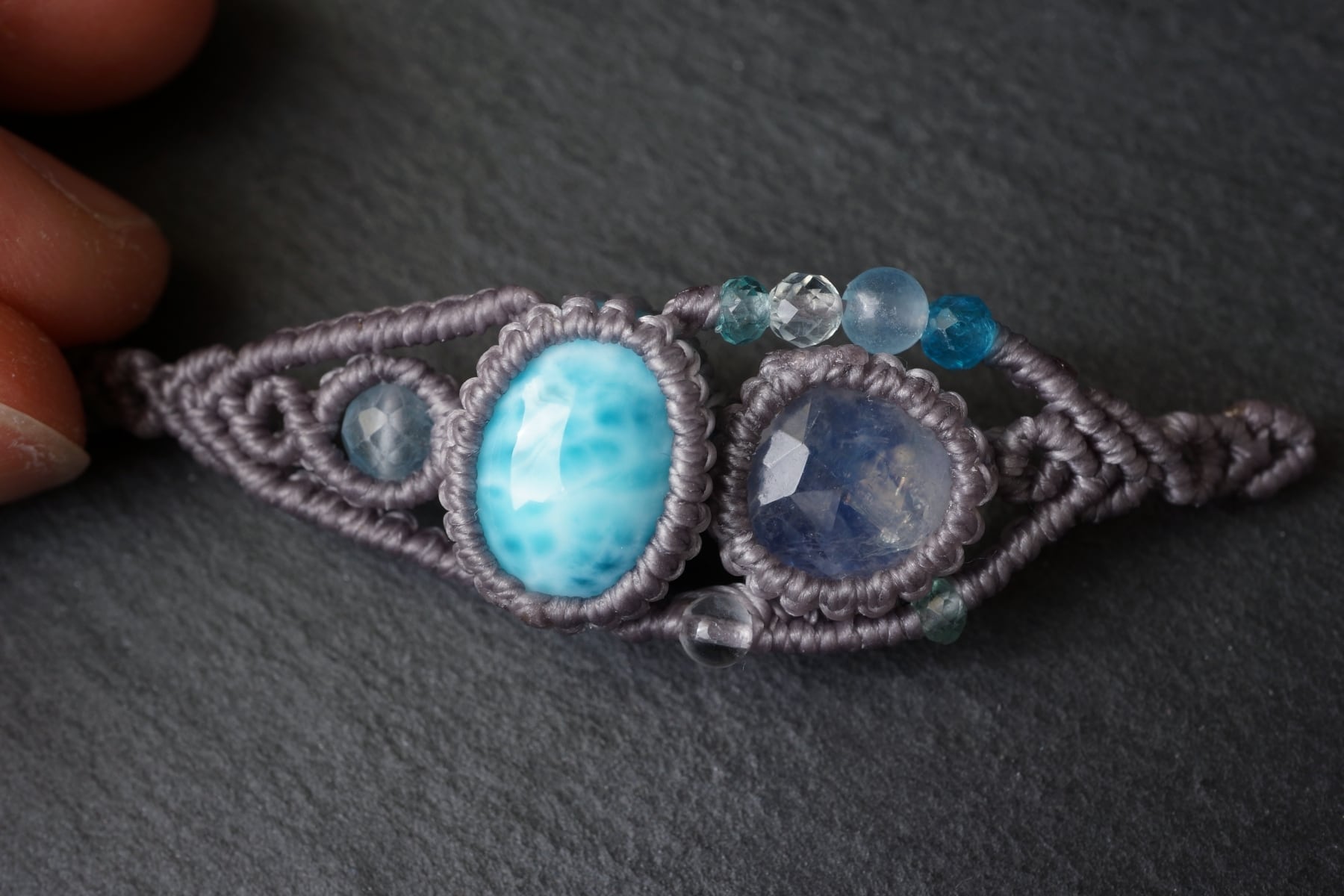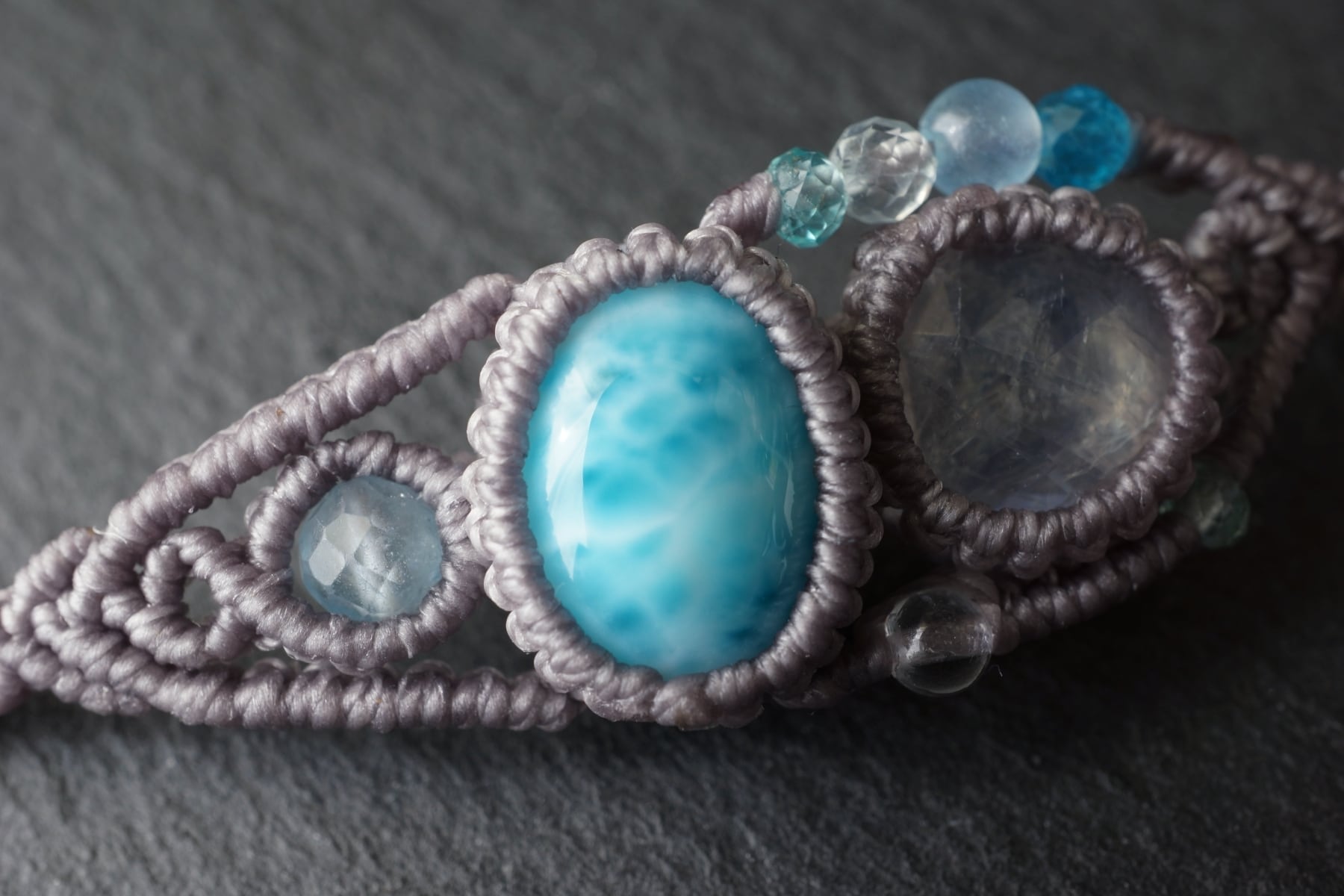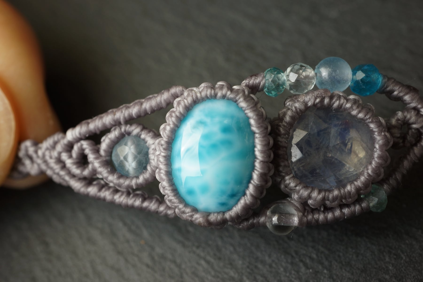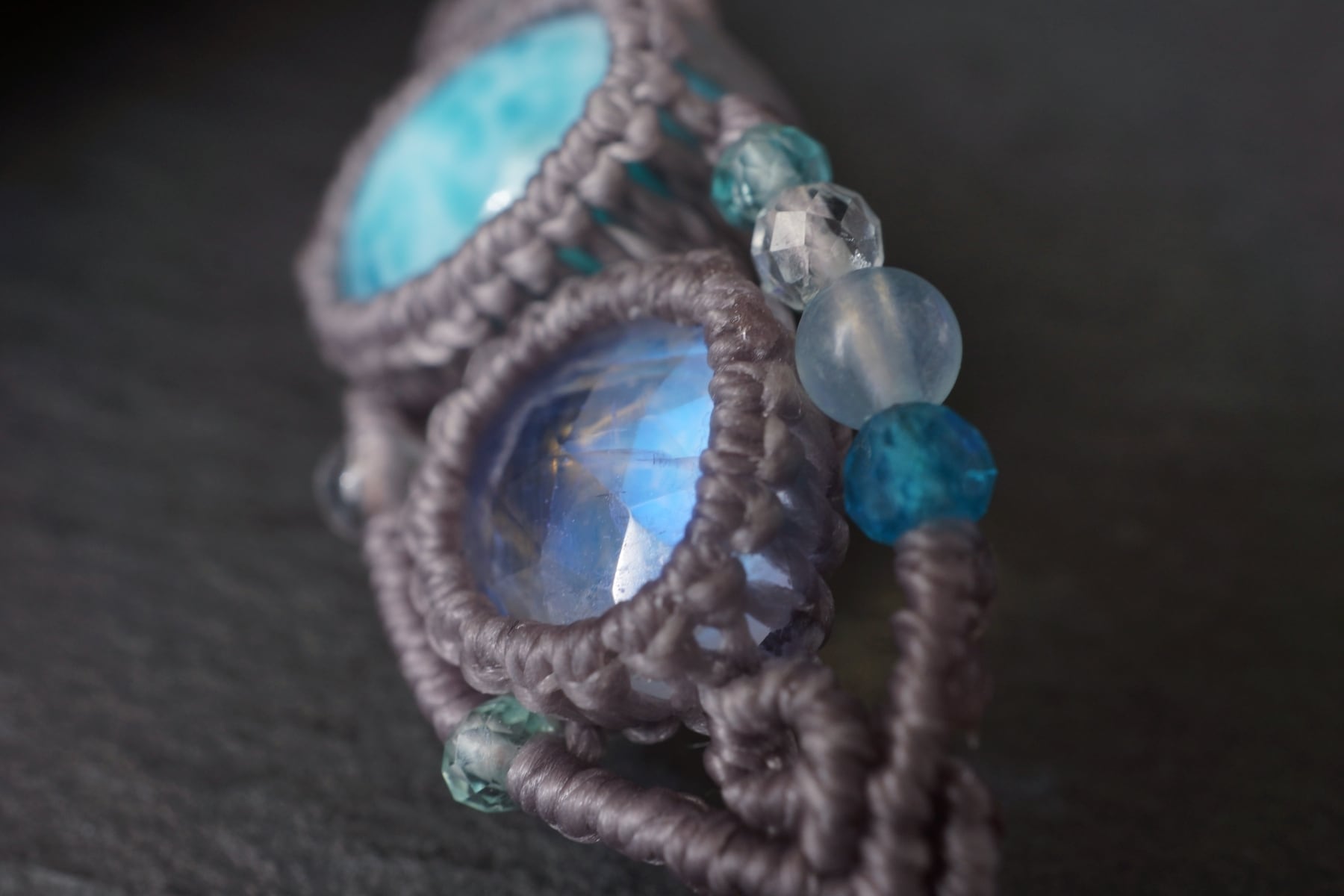 海のような鮮やかなブルーにくっきりとしたウロコ模様をもつラリマーと、透明度&ブルーシラーが魅力的なレインボームーンストーンを組み合わせ海をイメージして装飾したオリジナル一点物マクラメブレスレット。