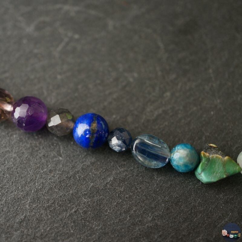 様々な個性を持つ天然石を7色カラーで繋いだお守りロングネックレス。