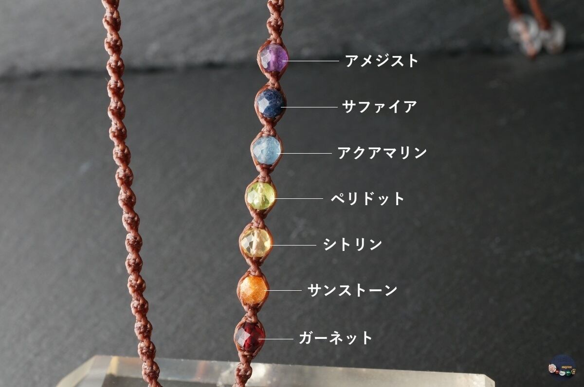 七種類の天然石を紐部分に入れたレトロで温かみある色合いの厄除けお守りネックレス。