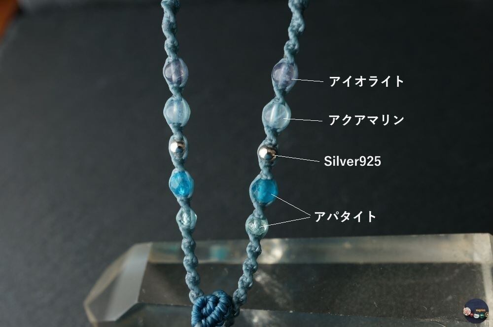 波の音をイメージしながら涼しげで爽やかなブルー系の天然石を紐部分に入れ、