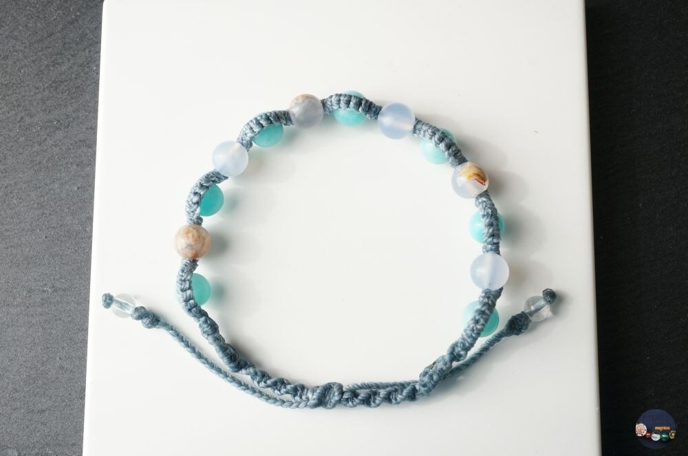 アマゾナイト&ブルーカルセドニーのお守りマクラメブレスレット<良縁を結ぶお守りに>【紐色チェンジ可】