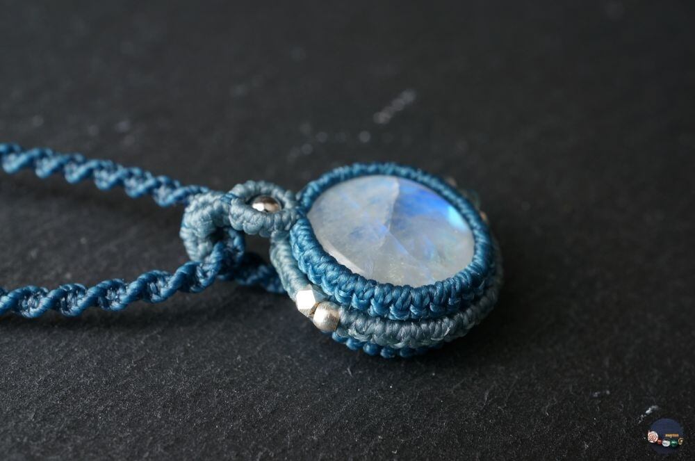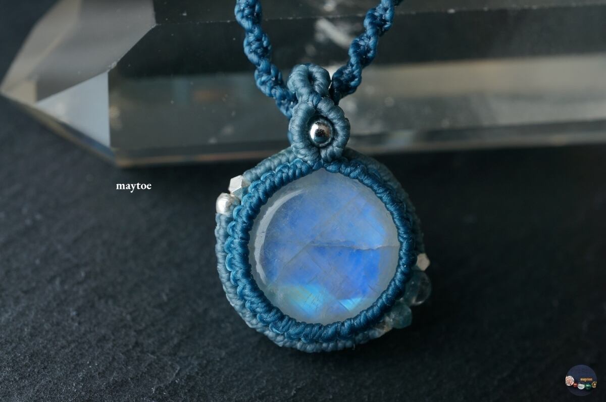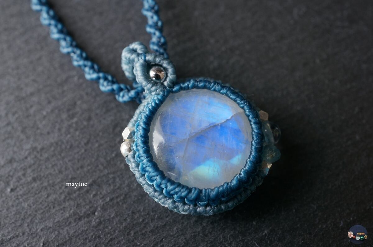幻想的なブルーの光を放つインド産レインボームーンストーンのマクラメネックレス。