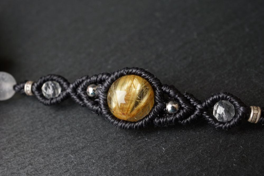 透明感があり、太い束状の金針がしっかりと入ったタイチンルチルクォーツをメインに1つ使用して編んだ温もりあるマクラメブレスレット。