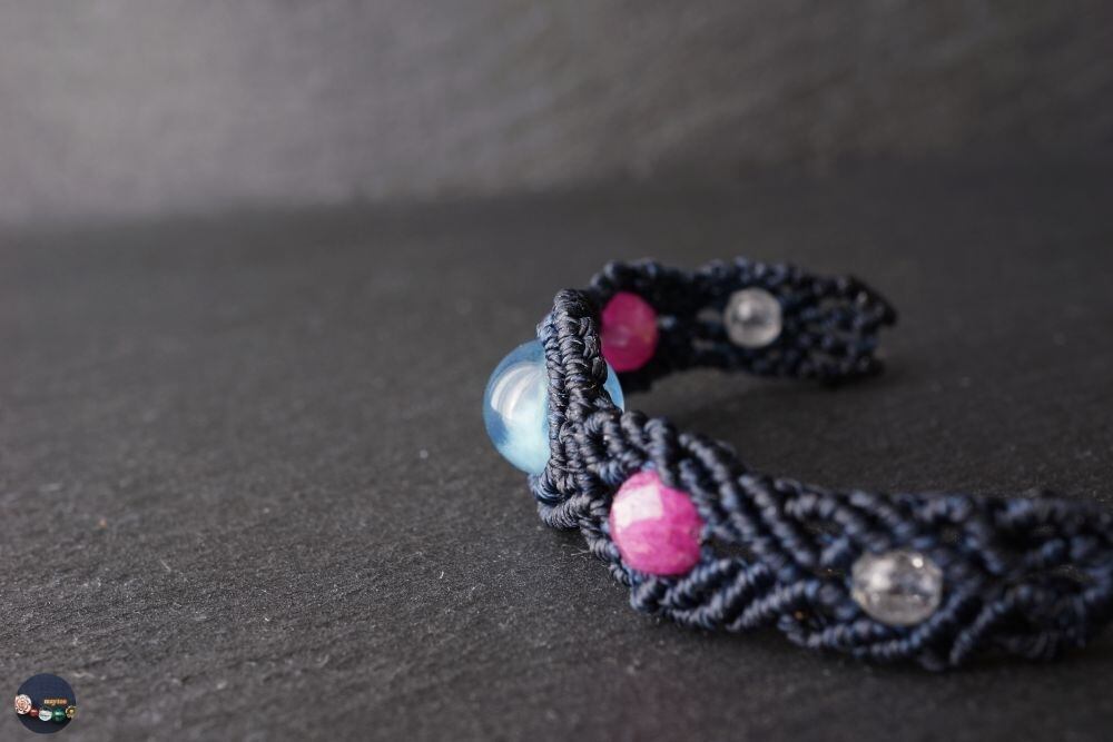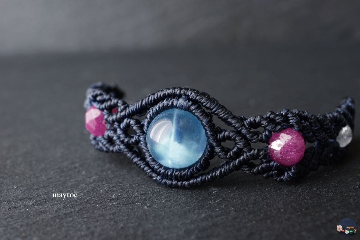 スターアクアマリンと、鮮やかな赤紫色をしたルビーを組み合わせたマクラメブレスレット。