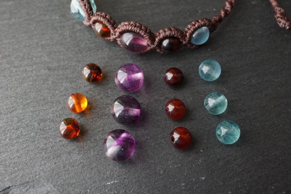 フローライト&アンバー(天然琥珀)のマクラメブレスレット【紐色チェンジ可】