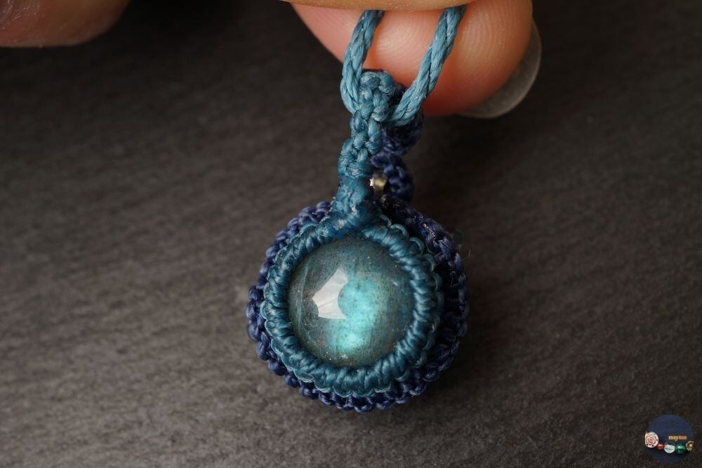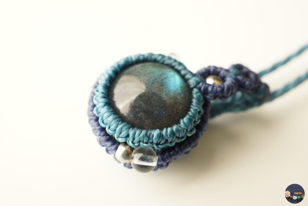 鮮やかなブルーグリーンのシラー(光)を放つラブラドライトのマクラメネックレス。