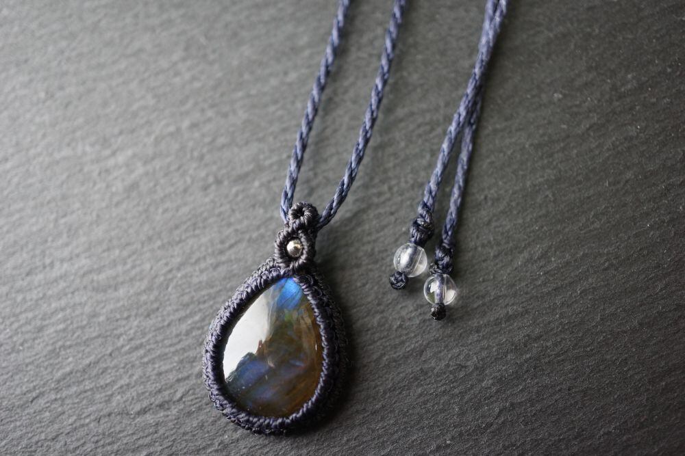 幻想的なブルーラブラドレッセンスを放つインド産ラブラドライトのマクラメネックレス。