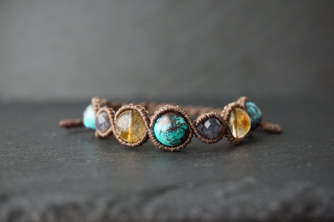 クリソコラ&シトリン&アイオライトのマクラメブレスレット『生活習慣を整えるお守りに』【紐色チェンジ可】