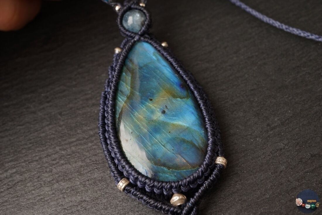 海のような色合いの美しいラブラドレッセンスを広範囲に放つインド産ラブラドライトのマクラメネックレス。
