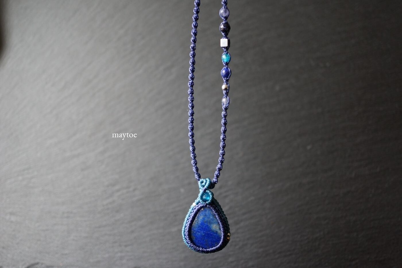 星空のような模様のラピスラズリをトップにしたマクラメネックレス。