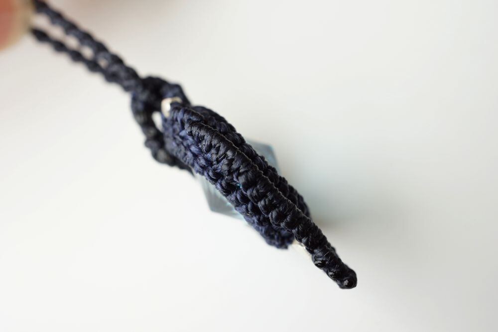 しずく型のラインを崩さないようシンプルに藍色の紐でマクラメ編みの装飾をしました。