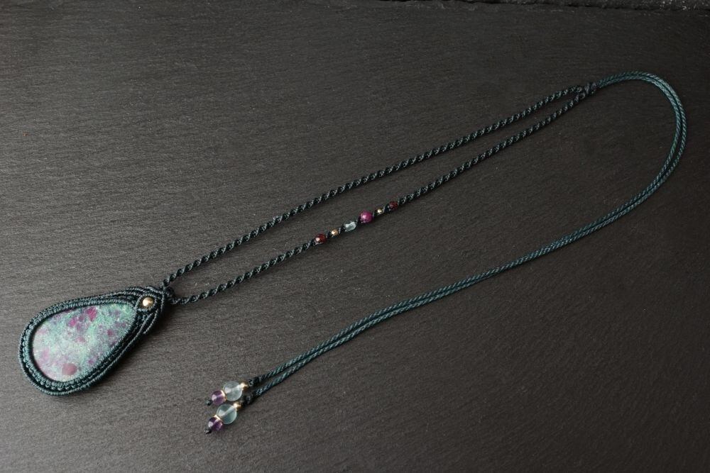緑のフックサイトと赤のルビーが混ざりあう鉱物「ルビーインフックサイト」のマクラメネックレス。